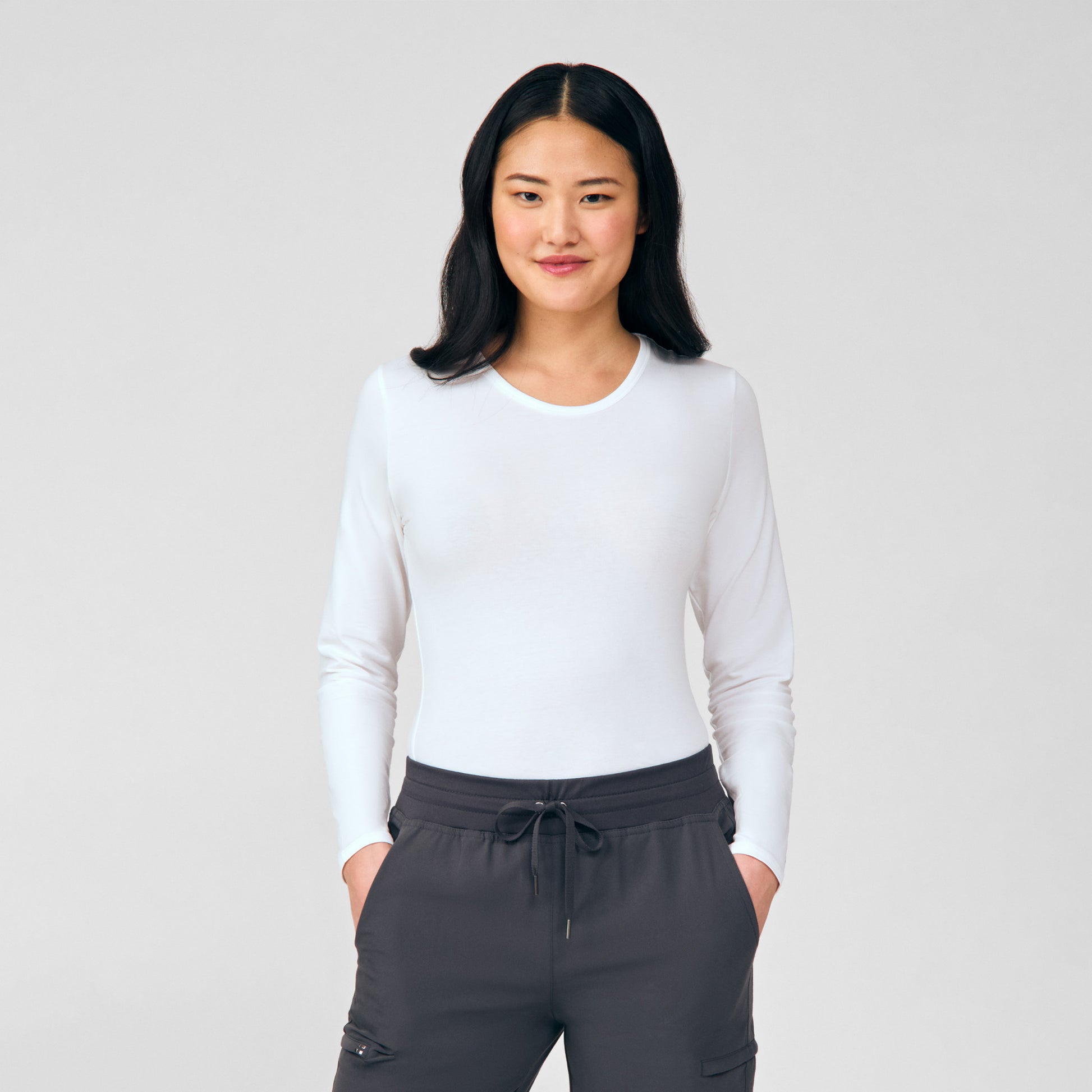 Designed and crafted for exceptional individuals. This breathable, extra soft jersey knit long-sleeve tee is contoured to fit your body and complement your shape. Meant to be worn from day to night, this crew neck under scrub offers 4-way stretch for extra mobility and comfort so you can perform your best at any time. Exceptional quality, exceptional style for exceptional people.