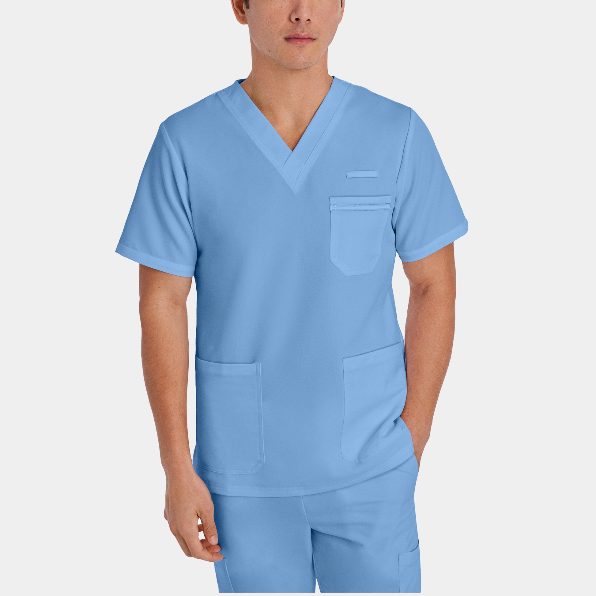 Our V-Tess men's 3-pocket v-neck scrub top features a breathable 4-way super stretch for maximum comfort and flexibility and vibrant colors that last wash after wash. With a fade resistant and super stretch material, this scrub top comes in a contemporary slim fit with a back yoke for a flattering shape. Not to mention, a contrasting stripe detail on the chest pocket and side vents for extra ease of movement.