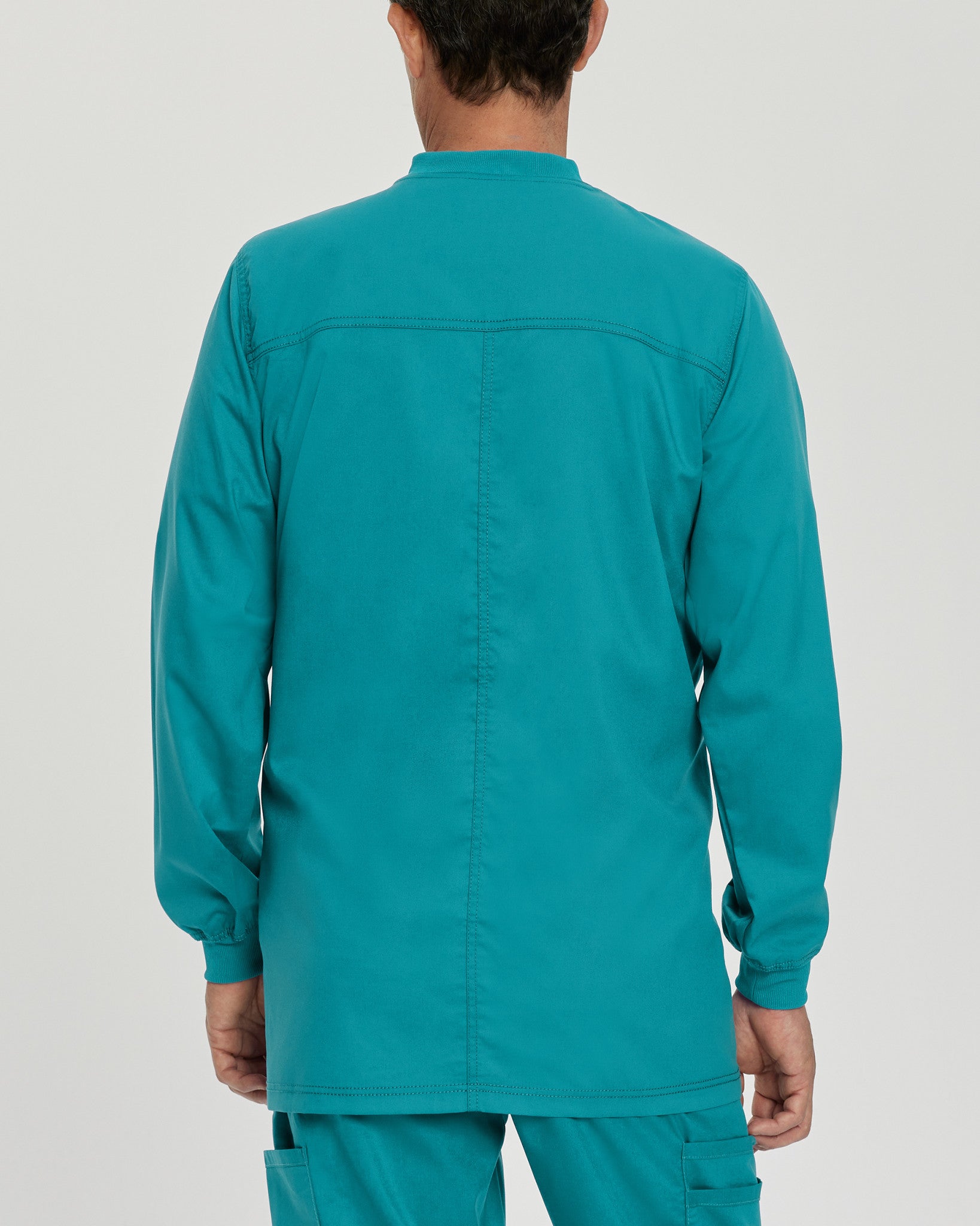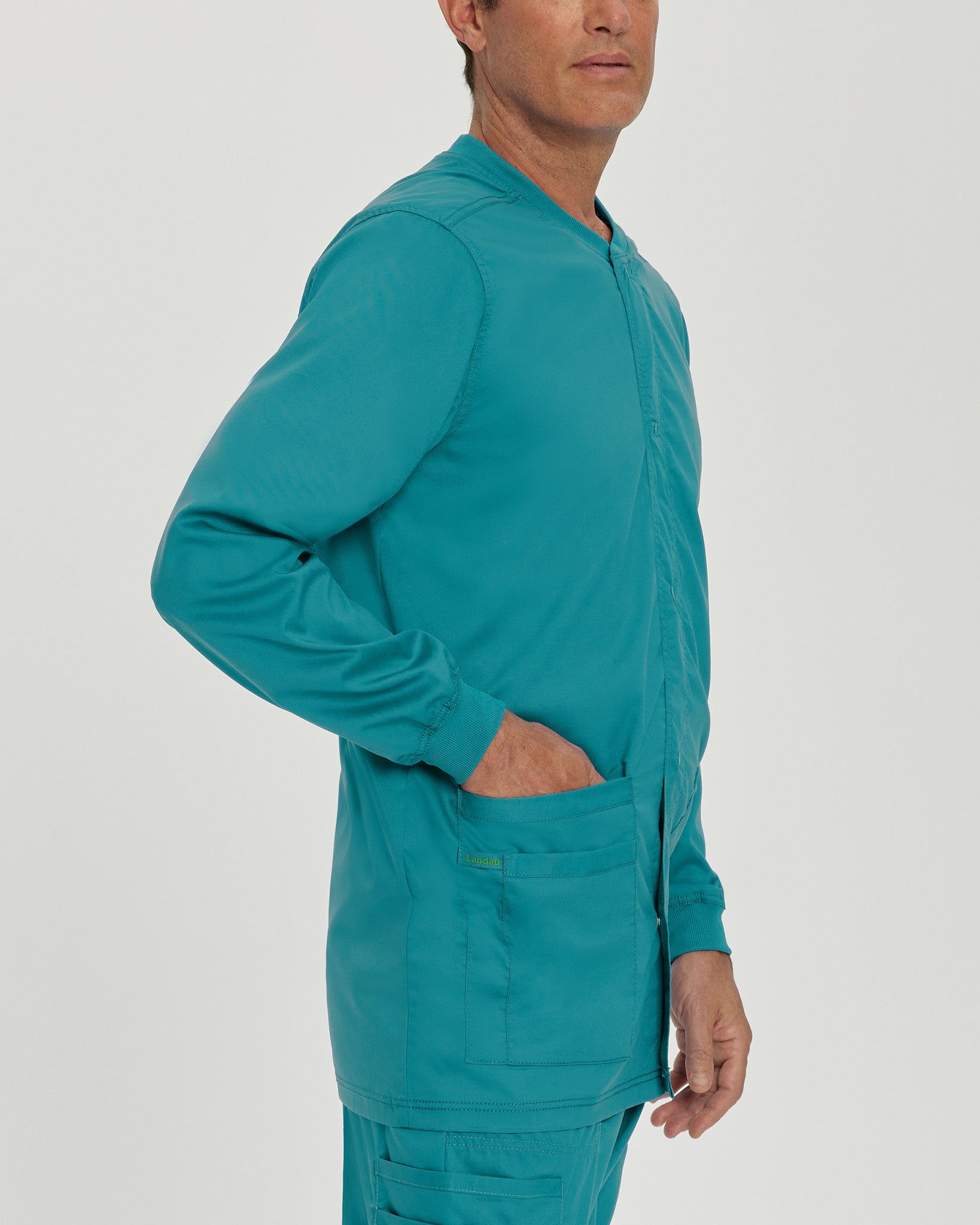 We design quality medical scrubs and medical uniforms with universal appeal. Stay snug, warm and ready for anything in this men's snap-front warm-up scrub jacket with a knit collar and knit cuffs that stay in place as well as back yoke detailing for a flattering shape. This scrub jacket features three total pockets, including one double patch pocket with an accessory loop and one single patch pocket for plenty of storage for your medical essentials. Our modern tailored fit is tapered to enhance your shape without constricting your movement, and our 2-way comfort stretch helps give you added flexibility required of your work wear. Whether it's Landau scrubs for men or scrubs for women, we're known for producing scrubs that work as hard as you do!