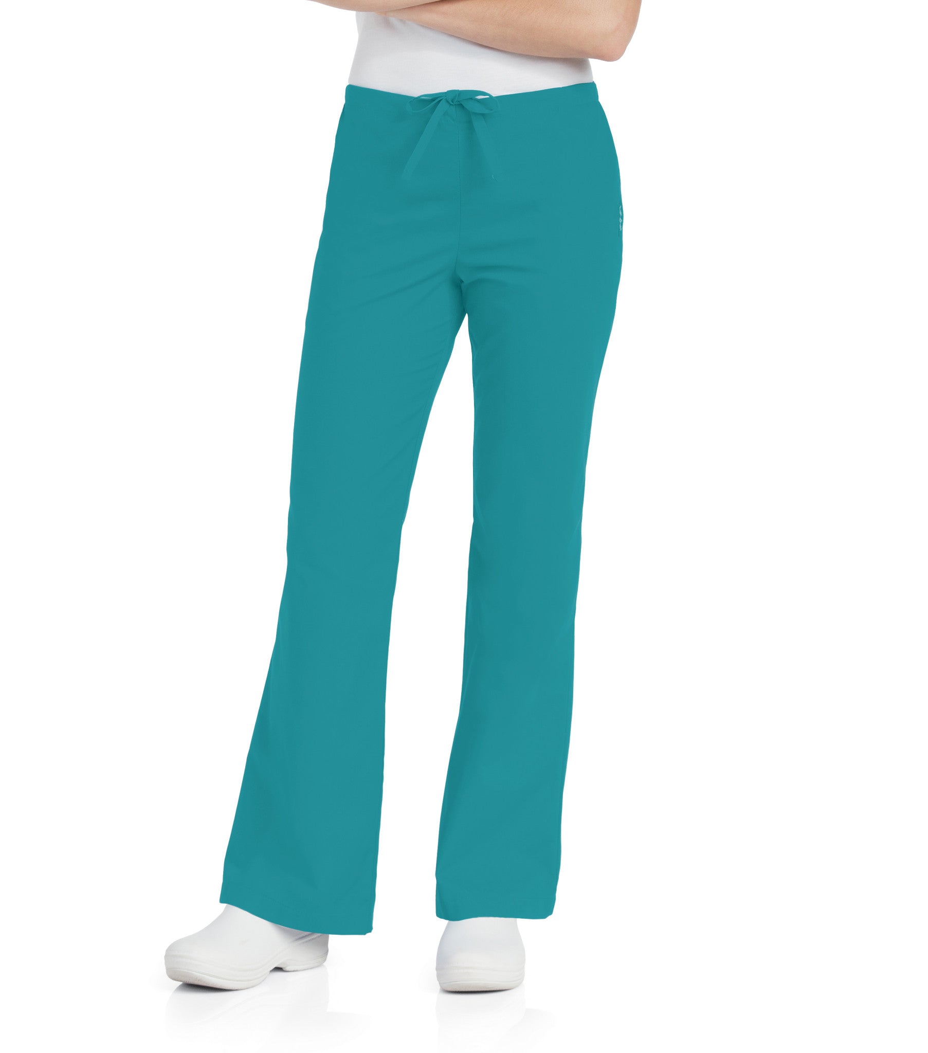 - Mid-rise 50/50 drawstring front, elastic back scrub pants