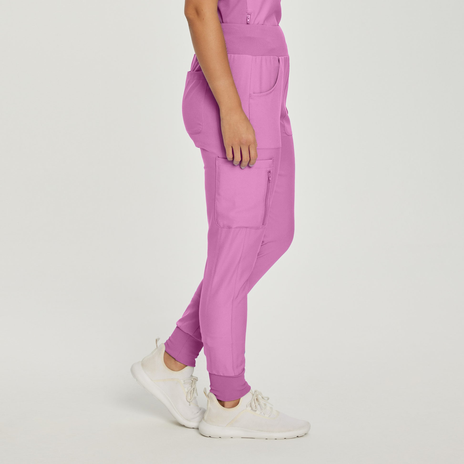 These women's mid-rise jogger scrub pants feature a stretchy rib-knit waistband with an internal drawstring for a clean look with an adjustable fit. Soft, comfortable rib-knit leg cuffs and hidden rib-knit panels down the inseam of the pant legs allows for ample freedom of movement. Our modern tailored fit flatters your shape, while our moisture-wicking super stretch fabric provides the comfort and flexibility your work requires throughout the day. Seven pockets, including a secure zip cargo pocket keep your essentials within easy reach.