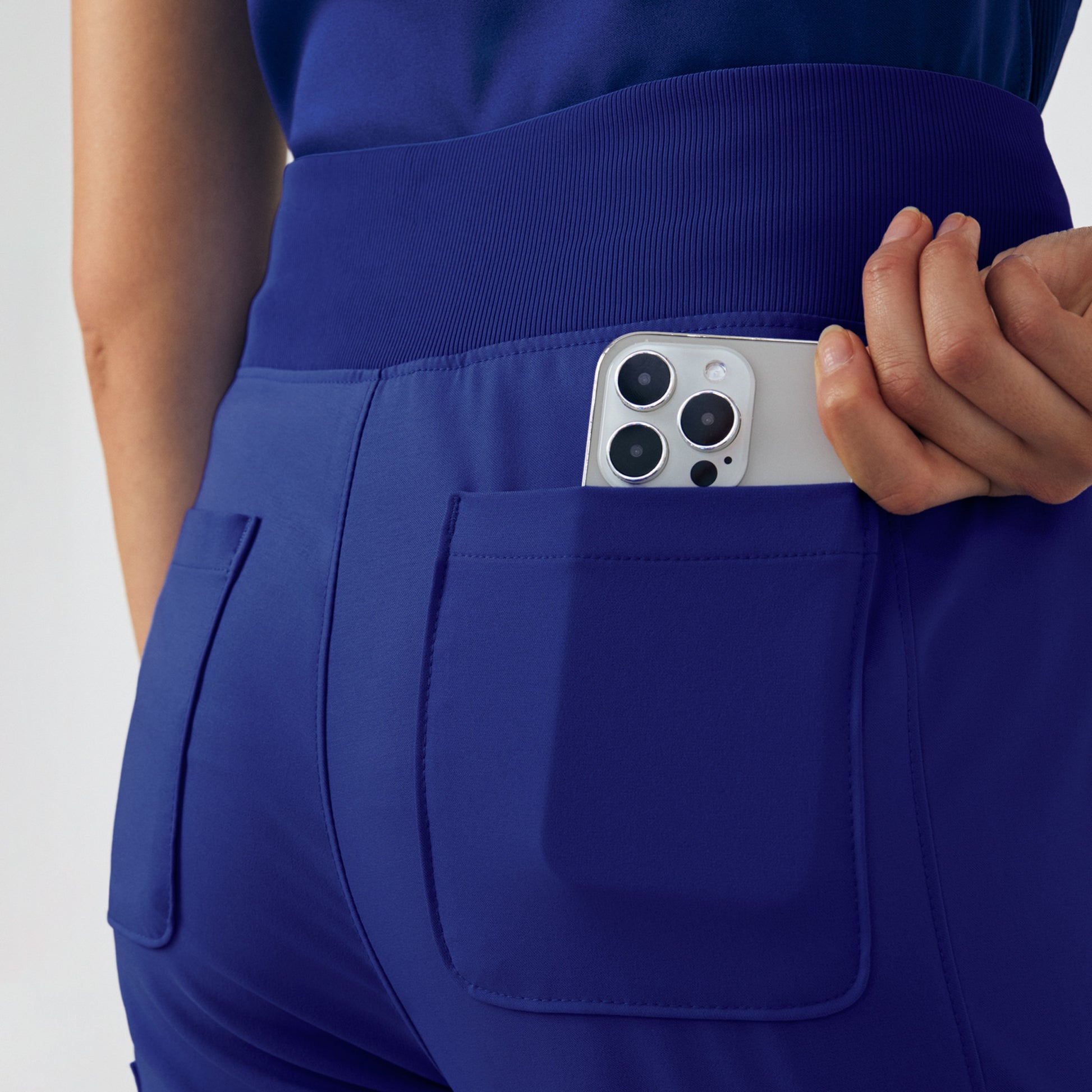 These women's mid-rise jogger scrub pants feature a stretchy rib-knit waistband with an internal drawstring for a clean look with an adjustable fit. Soft, comfortable rib-knit leg cuffs and hidden rib-knit panels down the inseam of the pant legs allows for ample freedom of movement. Our modern tailored fit flatters your shape, while our moisture-wicking super stretch fabric provides the comfort and flexibility your work requires throughout the day. Seven pockets, including a secure zip cargo pocket keep your essentials within easy reach.