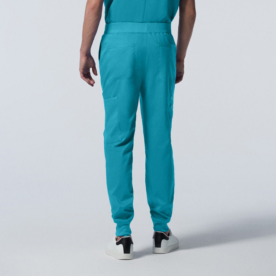 Men's Fit, zip fly jogger has a stretchy rib knit waistband with an internal drawstring. Rib knit bottom cuffs, 3 cargo pockets, 2 back pockets and 2 front pockets with 1 bungee loop to put your ID badge giving an easy access to instruments and accessories.