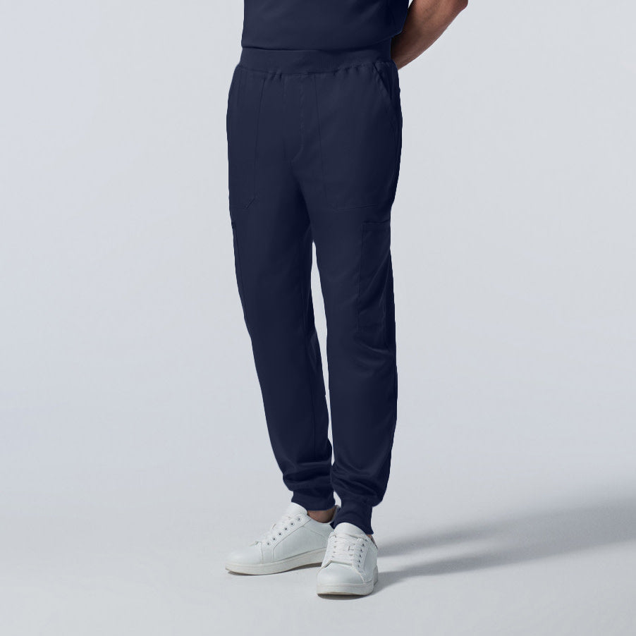 Men's Fit, zip fly jogger has a stretchy rib knit waistband with an internal drawstring. Rib knit bottom cuffs, 3 cargo pockets, 2 back pockets and 2 front pockets with 1 bungee loop to put your ID badge giving an easy access to instruments and accessories.
