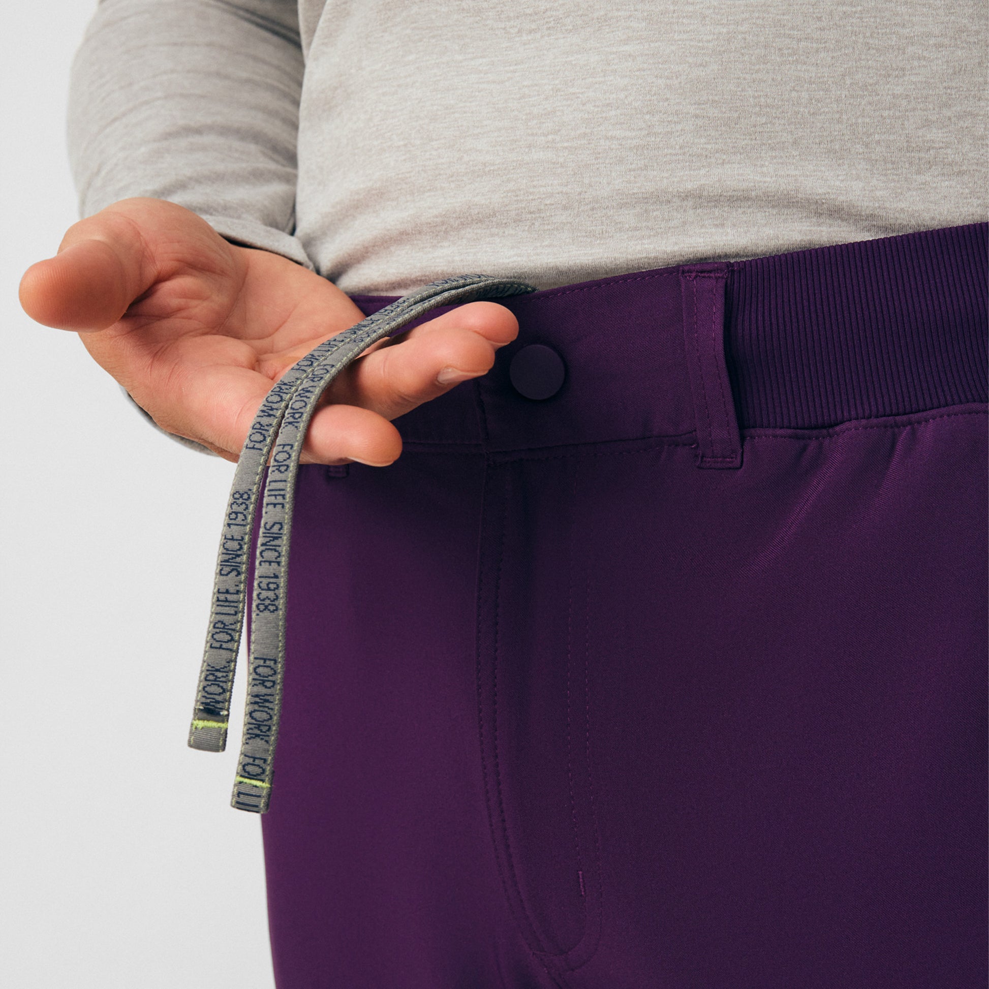 These versatile Men's fit, zip fly, tapered leg pant have a stretchy rib knit waistband with an internal adjustable drawstring, for comfort and security. This pant also provides a generous amount of storage that meets the demands of your busy workday with 2 front pockets, 2 Cargo pockets, 2 Back pockets and a bonus hidden front money clip pocket and a hidden back zip pocket.