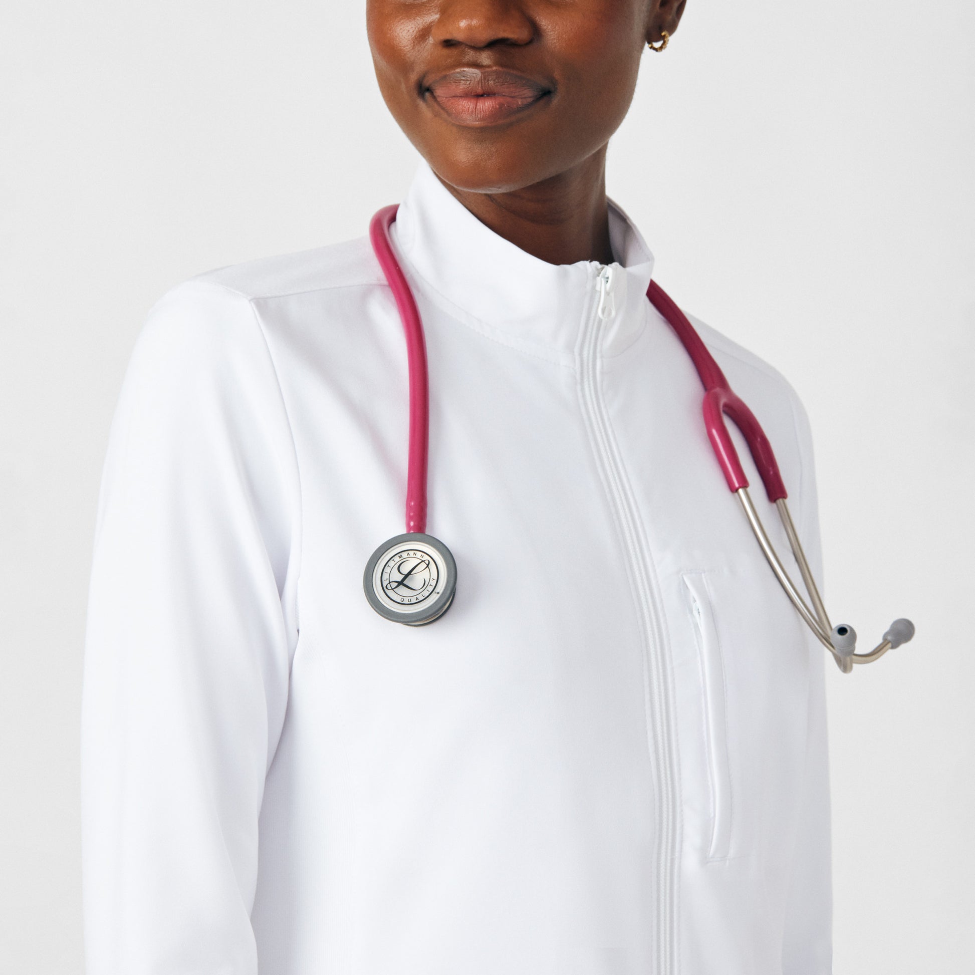 This must-have women's sporty zip-front scrub jacket is the perfect layering outerwear over your scrub top and has great functional side seam pockets and a zipper chest pocket to secure your personal essentials. Our modern tailored fit flatters your shape, while our moisture-wicking super stretch fabric provides the comfort and flexibility your work requires throughout the day.
