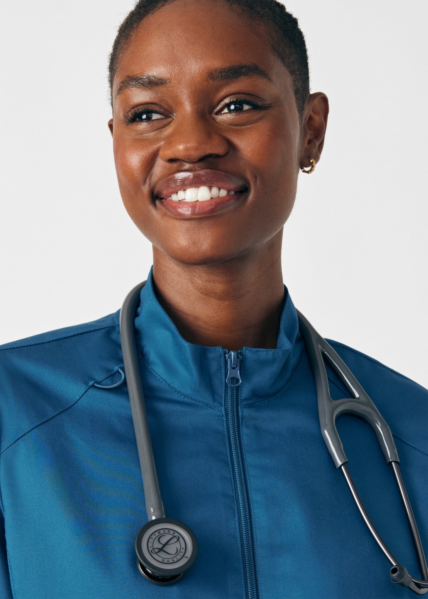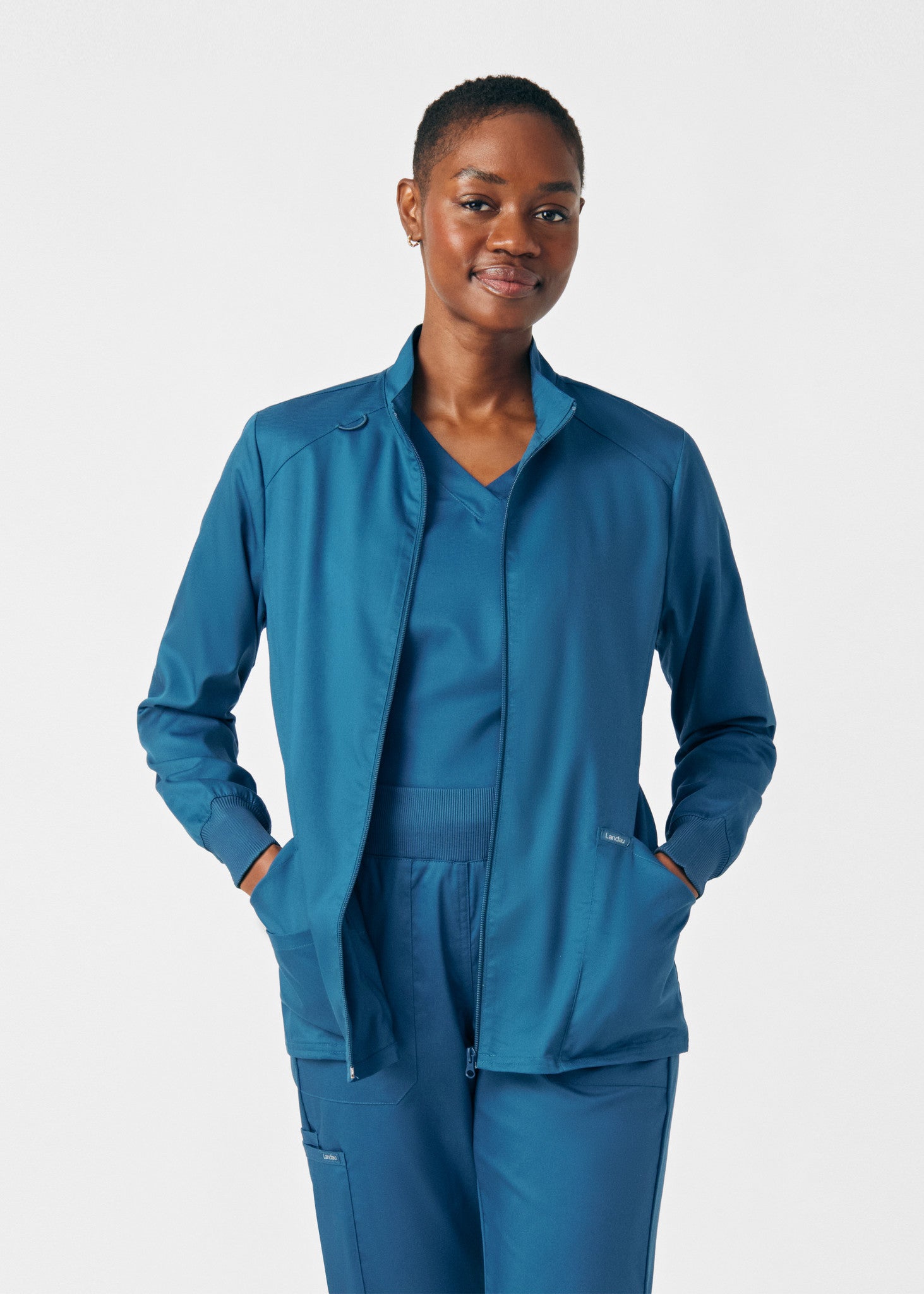 Stay warm and comfortable with this sporty, Modern Fit jacket! With front and back princess seams, rib knit cuff sleeves, mock neck collar, ID badge loop, 2 large pockets and 1 Small pocket with a hidden elastic loop to keep your accessories organized. This jacket can go from home to office any day.
