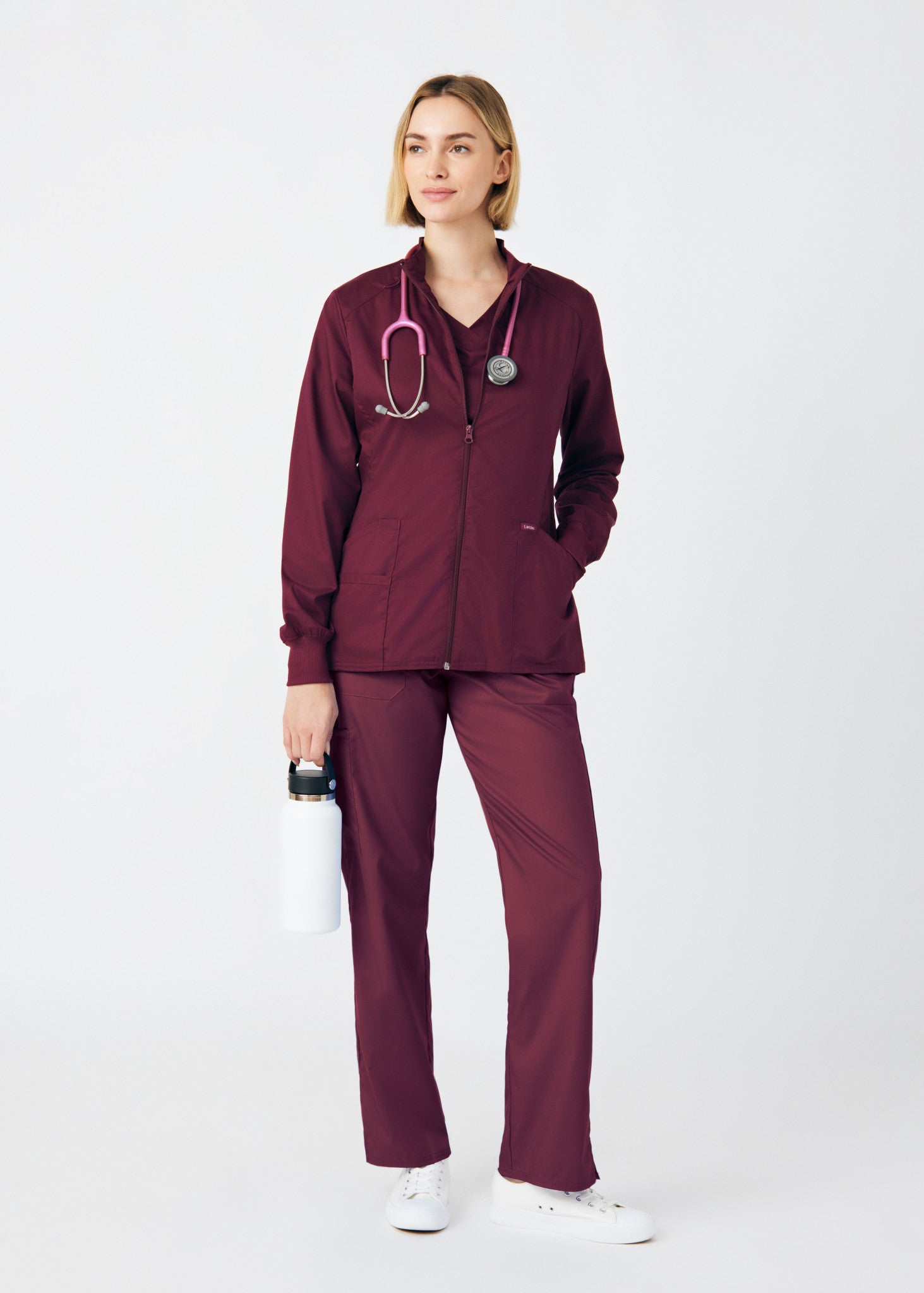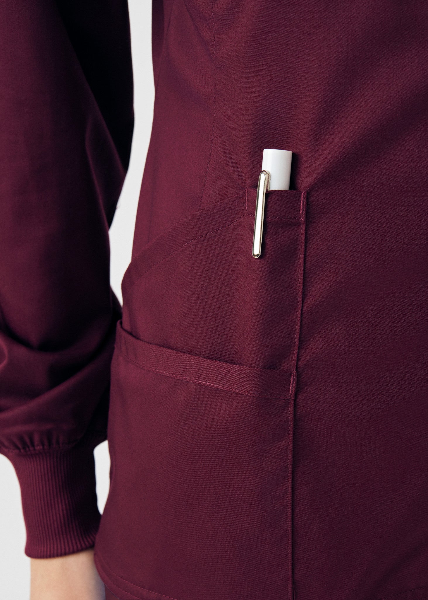 Stay warm and comfortable with this sporty, Modern Fit jacket! With front and back princess seams, rib knit cuff sleeves, mock neck collar, ID badge loop, 2 large pockets and 1 Small pocket with a hidden elastic loop to keep your accessories organized. This jacket can go from home to office any day.