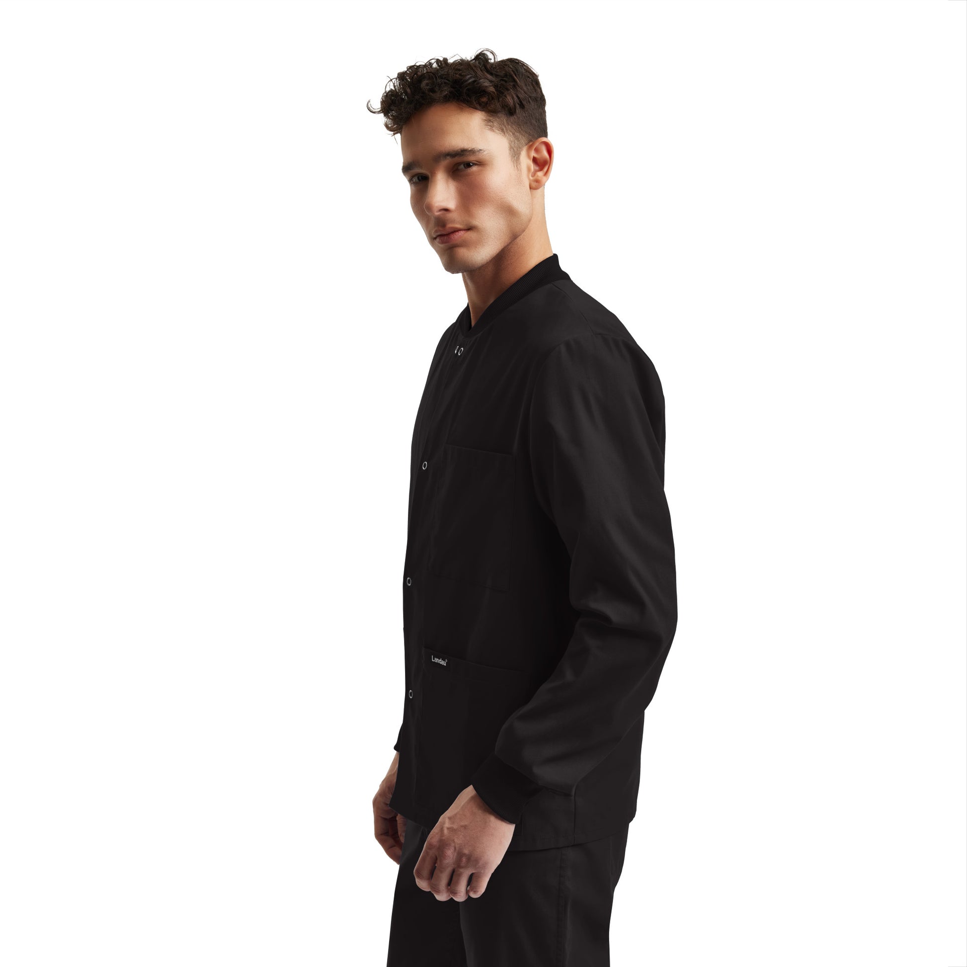 This unisex snap front warm-up jacket, offers comfort and warmth in the workplace. It includes rib knit cuffs and collar for added coziness and provides ample space for accessories, featuring one chest pocket, two large pockets, and a bonus cell pocket to securely hold your items. Additionally, it comes with an internal utility loop and an earbud pocket for easy accessibility.