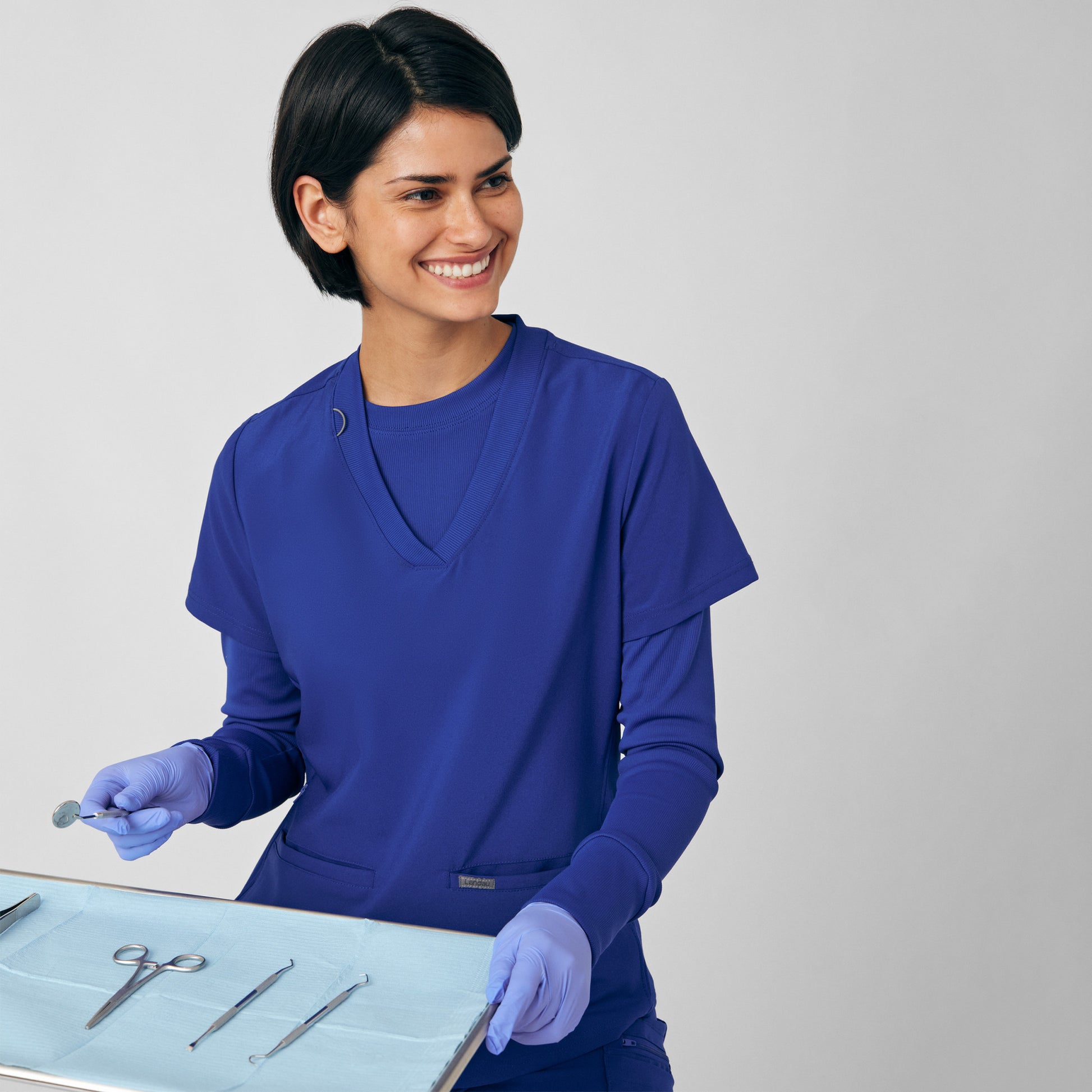 You will fall in love with this women's scrub top with its soft rib-knit side panels and neckband, which allow for comfort and ease of movement. Two front welt pockets and a badge loop provide plenty of storage and an on-seam zipper pocket keeps your items secure. Our modern tailored fit flatters your shape, while our moisture-wicking super stretch fabric provides the comfort and flexibility your work requires throughout the day.