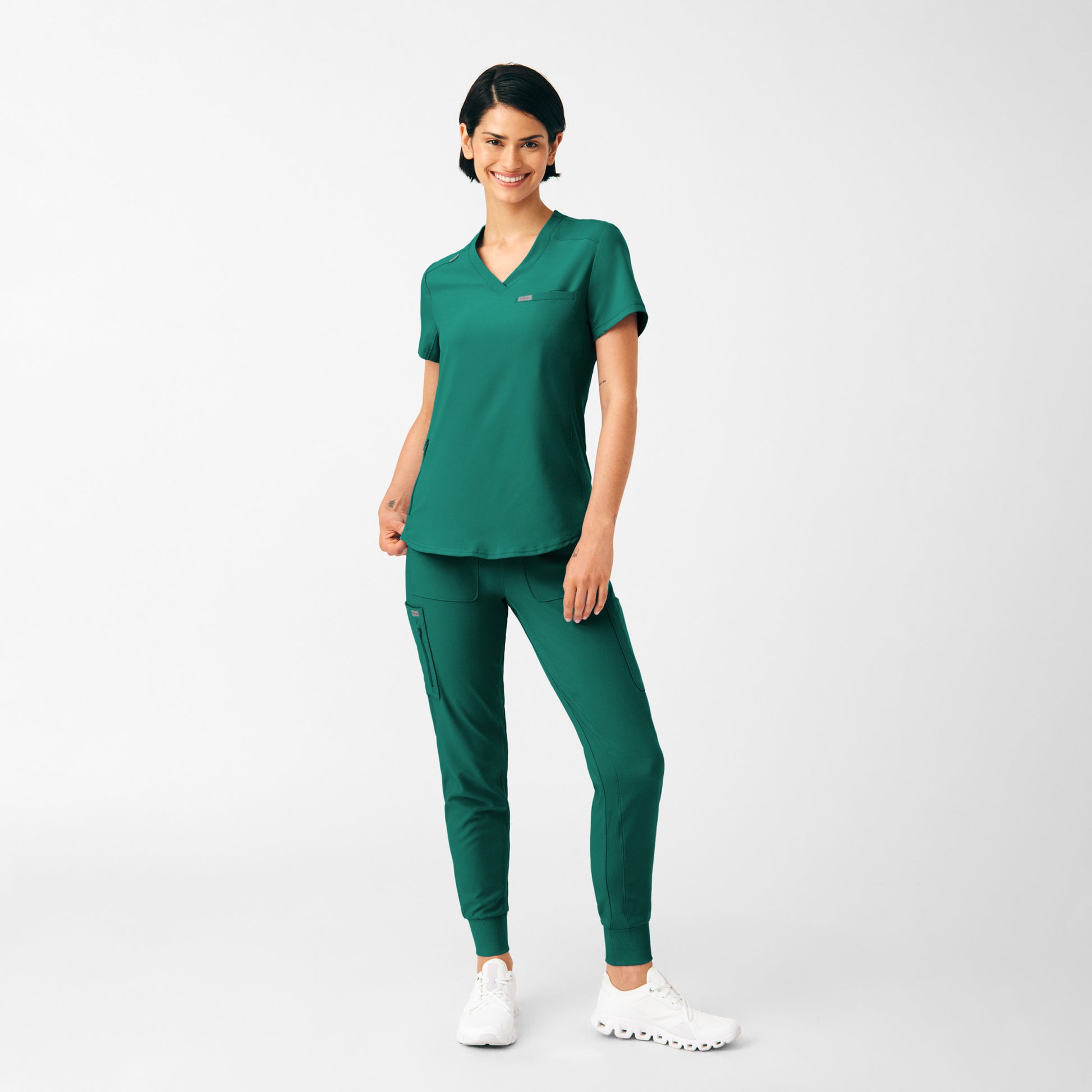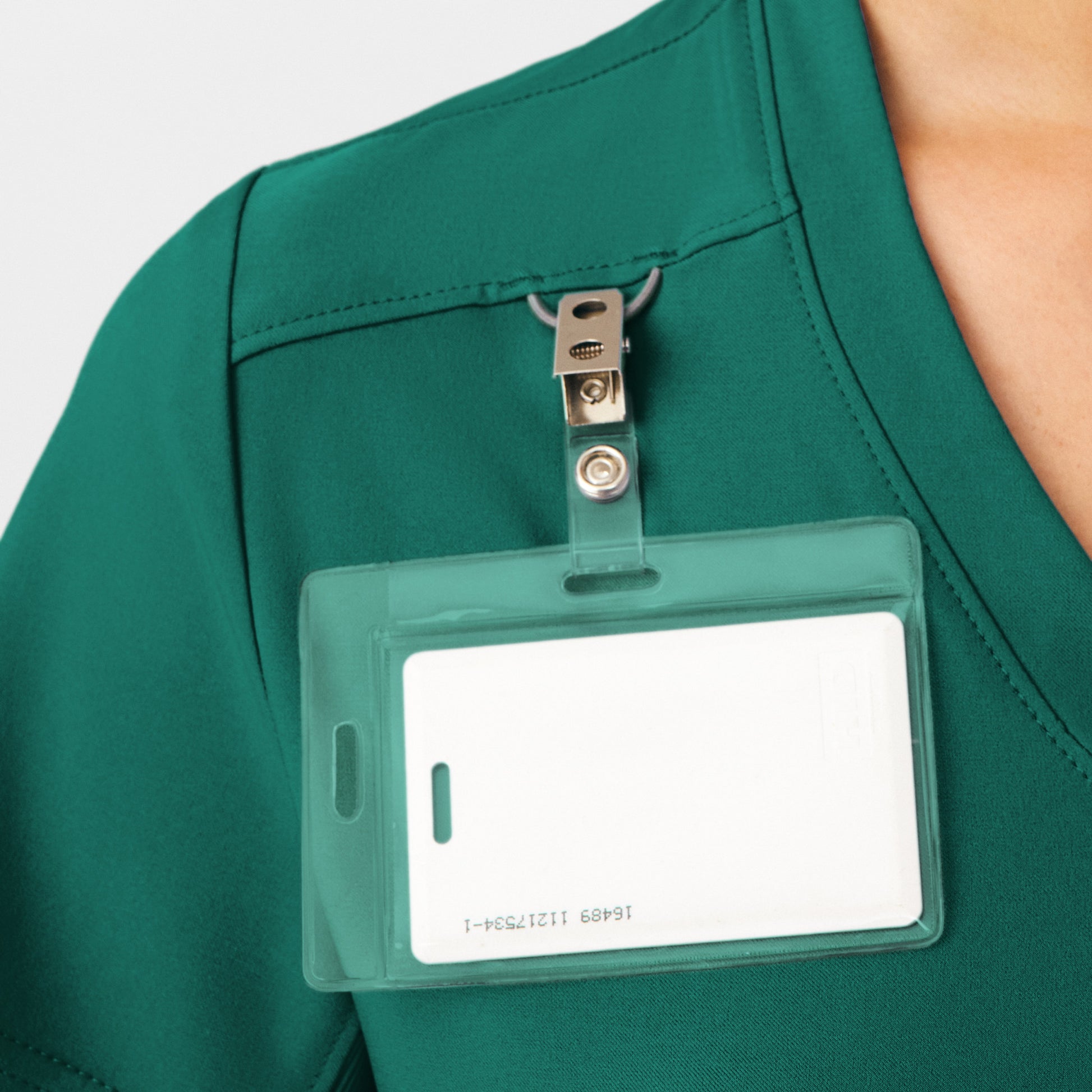 This modern fit scrub top features a soft rib-knit back neckband and rib-knit side panels for a comfortable and sleek fit. With a front welt chest pocket and right front zip security pocket, this top is the definition of a high-functioning style. Our modern tailored fit flatters your shape, while our moisture-wicking super stretch fabric provides the comfort and flexibility your work requires throughout the day.