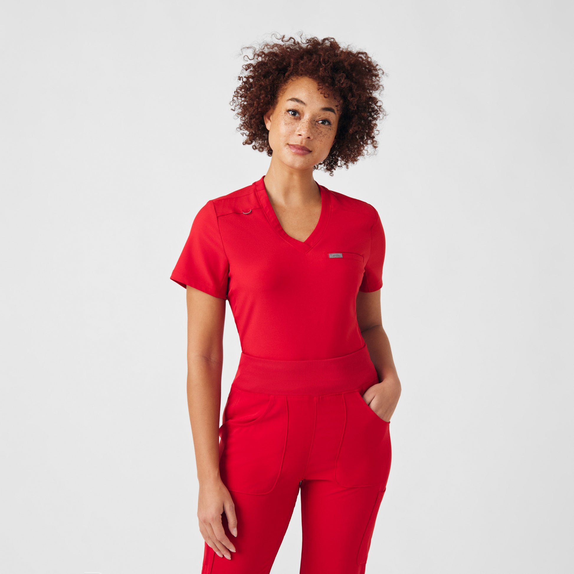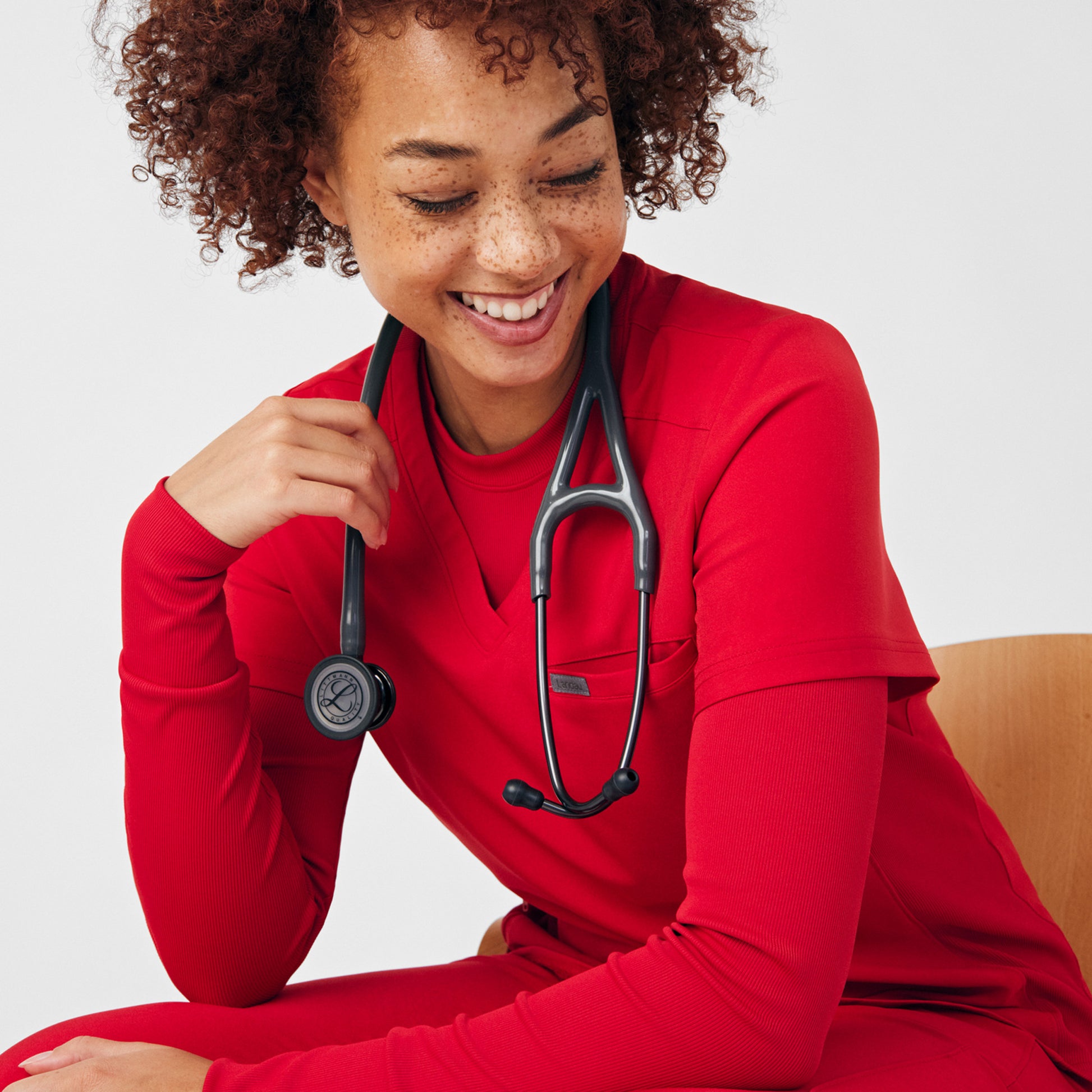 This modern fit scrub top features a soft rib-knit back neckband and rib-knit side panels for a comfortable and sleek fit. With a front welt chest pocket and right front zip security pocket, this top is the definition of a high-functioning style. Our modern tailored fit flatters your shape, while our moisture-wicking super stretch fabric provides the comfort and flexibility your work requires throughout the day.