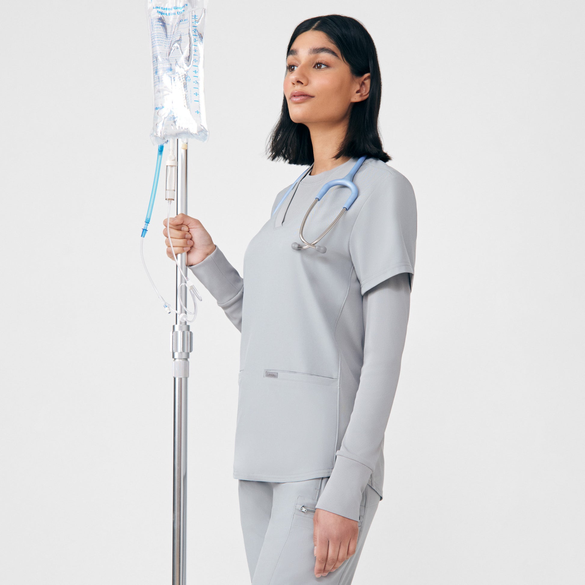 This contemporary layering underscrub tee is made with figure flattering rib knit with wrap-around side seams and a zipper pocket at the left cuff to keep your personal essentials safe. This long-sleeve tee is the perfect way to add warmth to your wardrobe when you're working in cold environments.