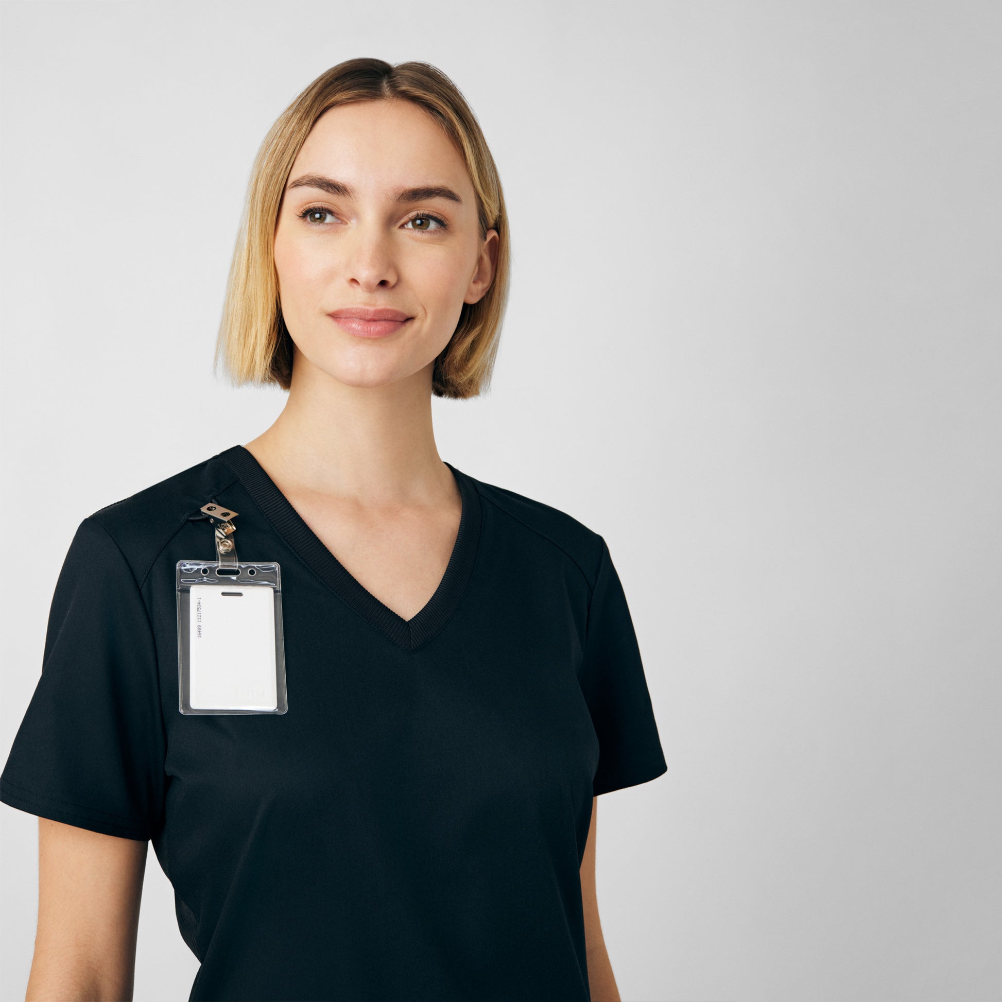 This Modern Fit, V-neck top not only is comfortable and high functioning. It features a rib knit neckband and back panels for extra comfort and movement. 2 Large pockets with a hidden elastic to hold stationary items close at hand an additional small pocket and side vents makes it perfect for your busy workday.