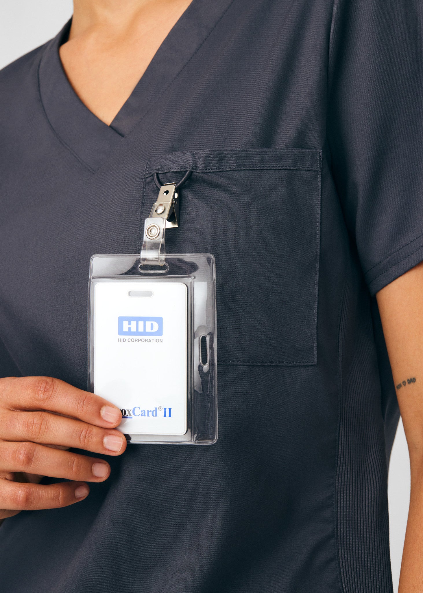 A Modern Fit, V-neck top with princess seams, and features rib knit side panels to provide comfort as you move through out your day. With a front chest pocket and a additional back side pocket to hold additional items, it can be worn untucked, half tucked, or fully tucked.