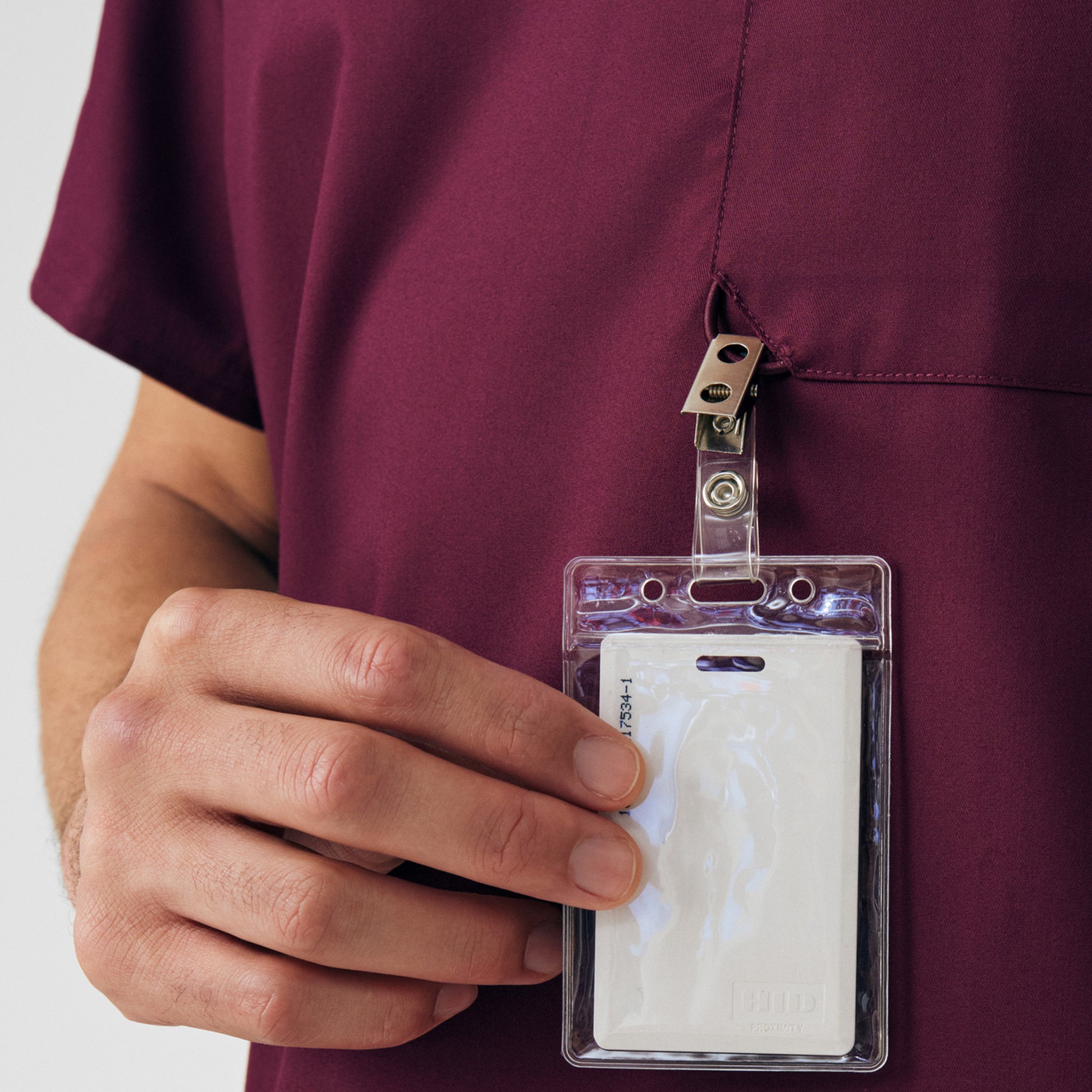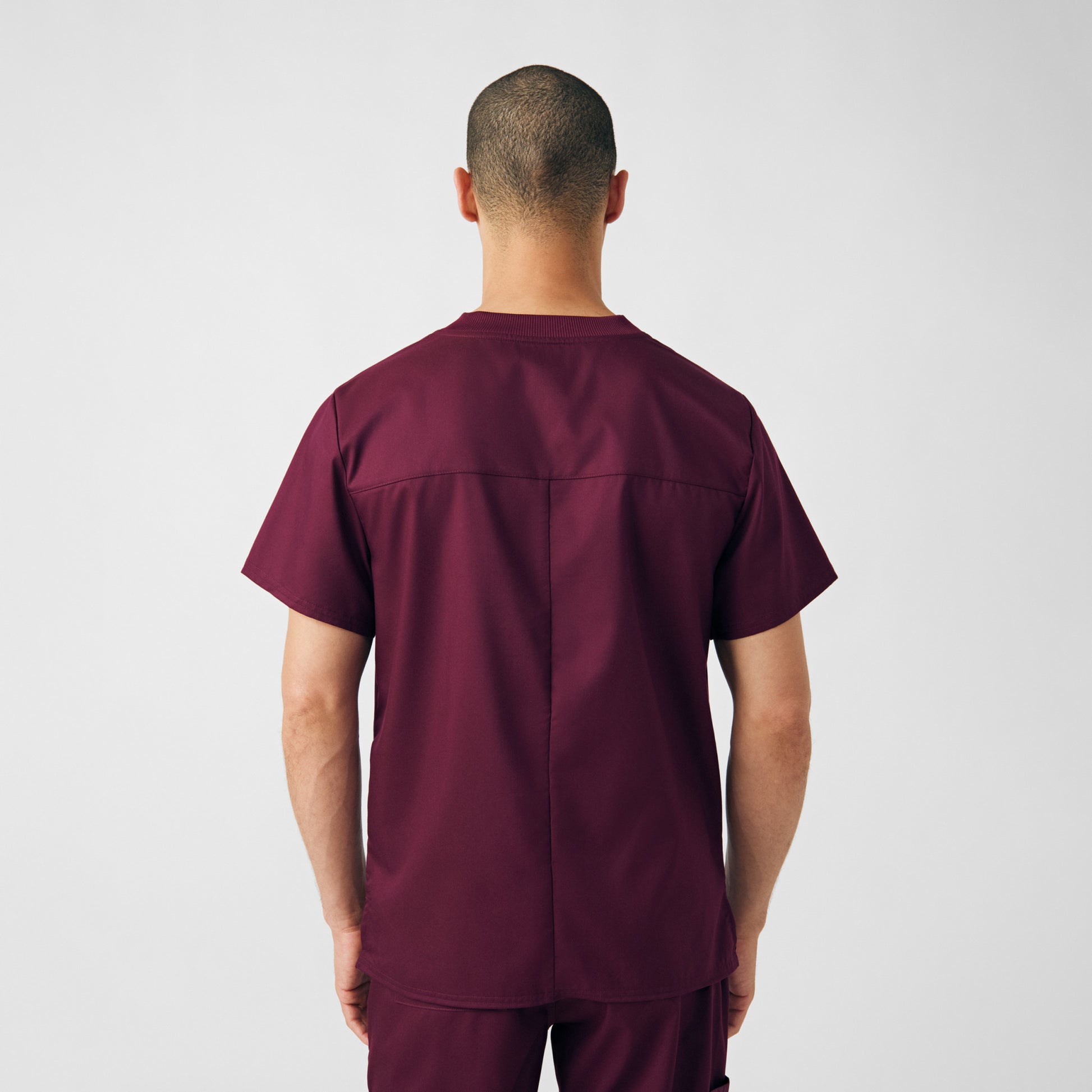 Men's Fit, V-neck with a half rib knit neckband, side vents, double chest pocket with a bungee loop, can be worn untucked, half tucked, or fully tucked.