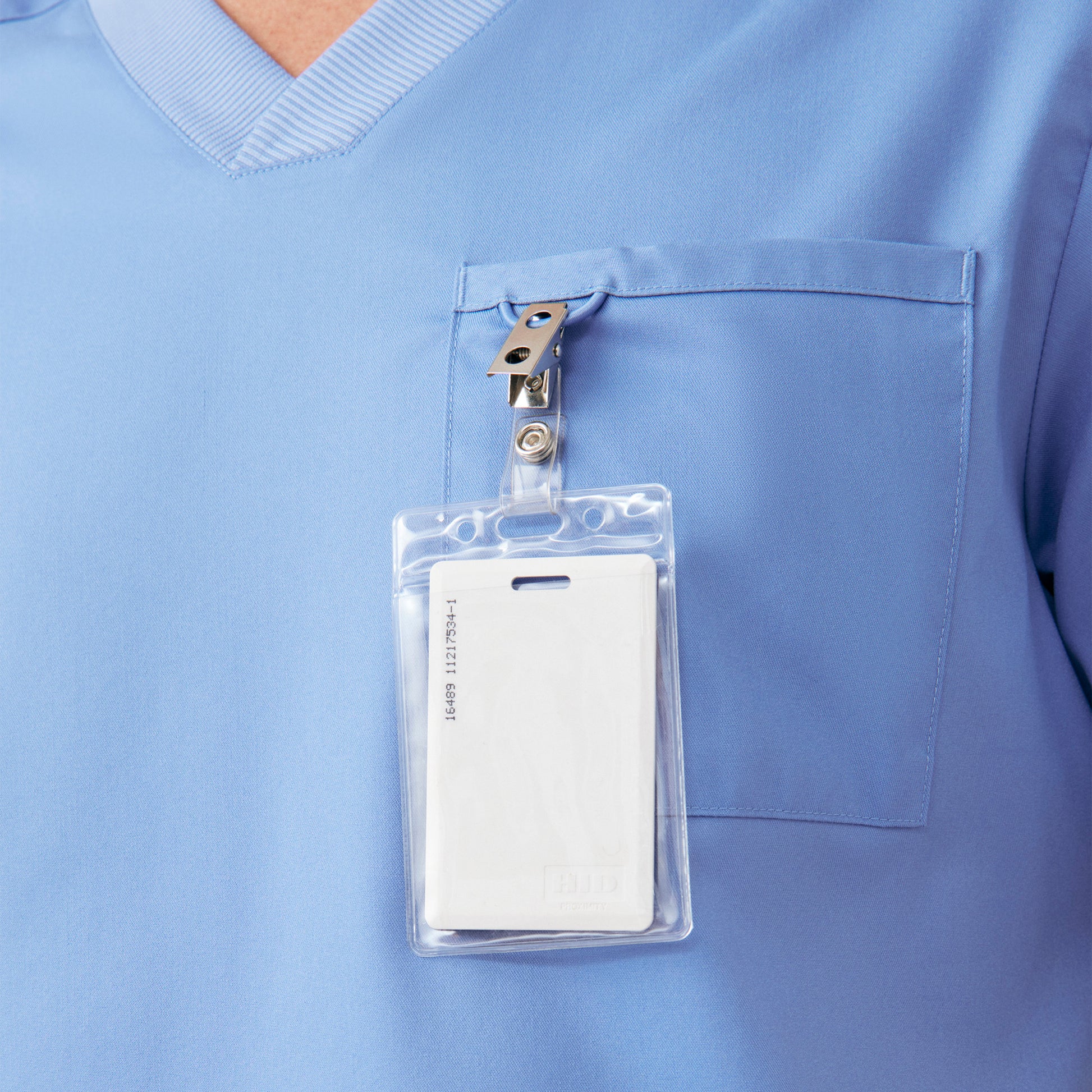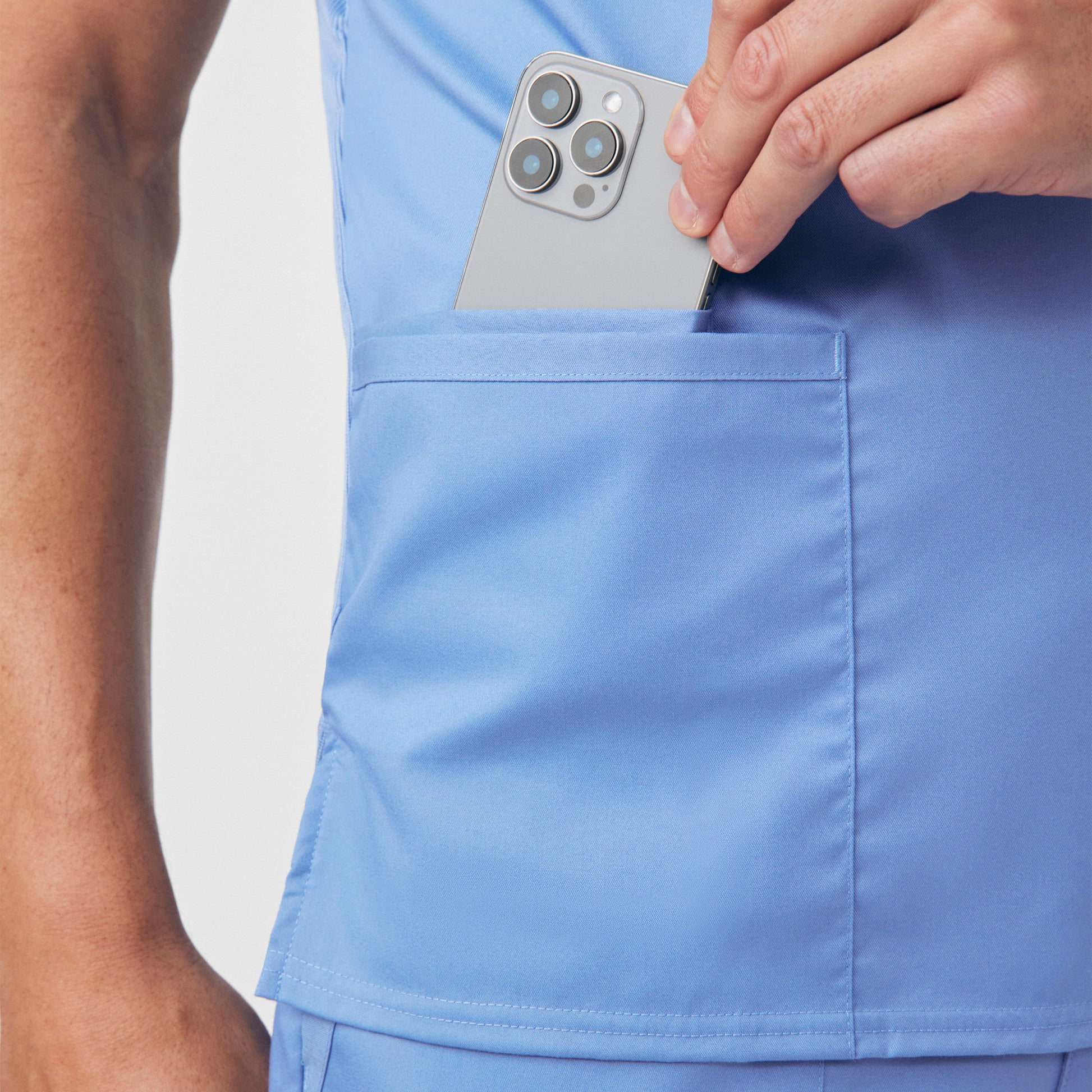 Men's Fit, V-neck top with a rib knit neckband and back side panels. Has 3 pockets with one pocket having a hidden elastic loop for stationary items and one chest pocket that comes with a ID badge loop making this top an everyday essential.