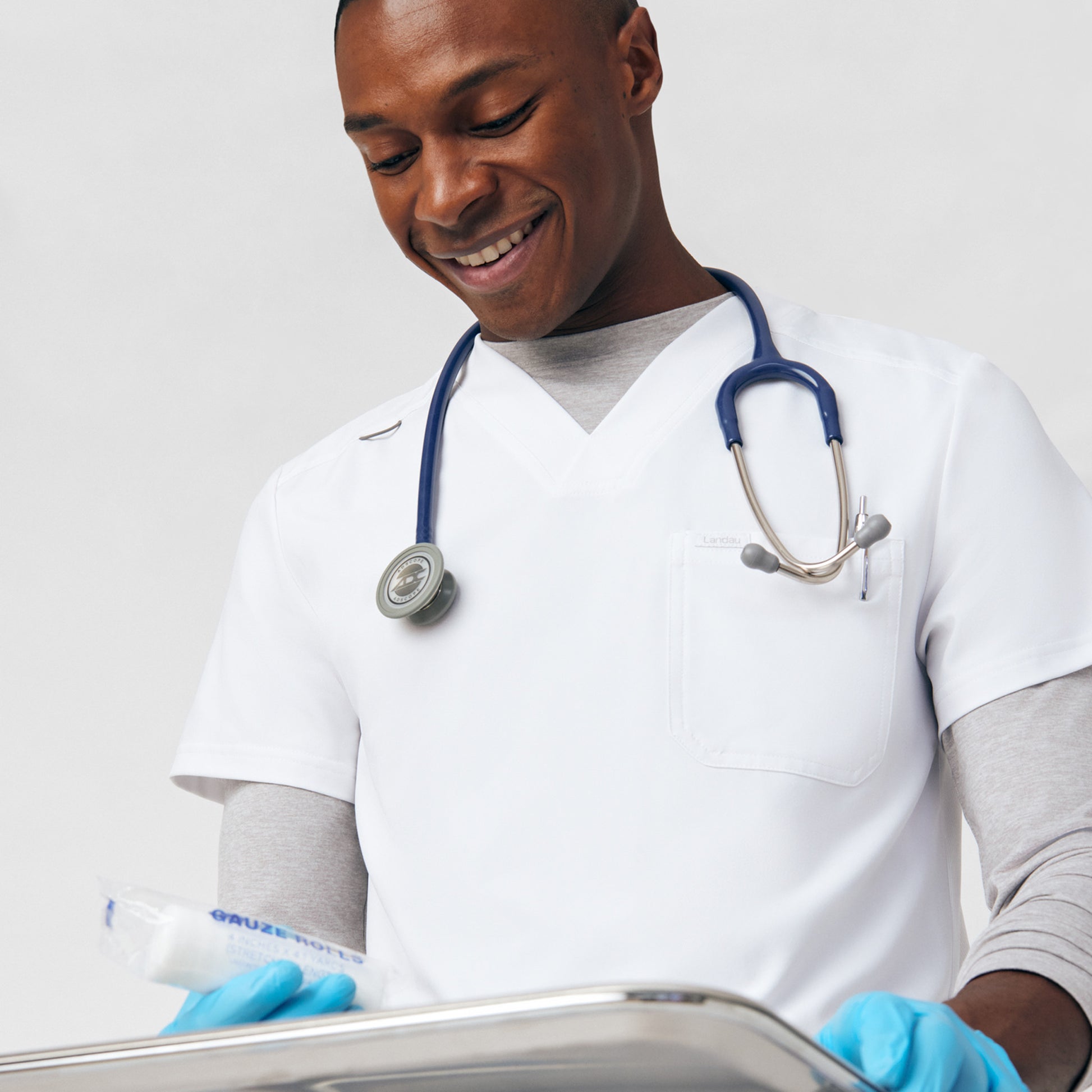 Men's Fit, V-Neck top with awesome details such as back rib panels and back neck band to provide a sporty edge, comfort and sleek fit. With 2 pockets, 1 Chest pocket, an ID badge loop and a bonus zip pocket for extra storage.