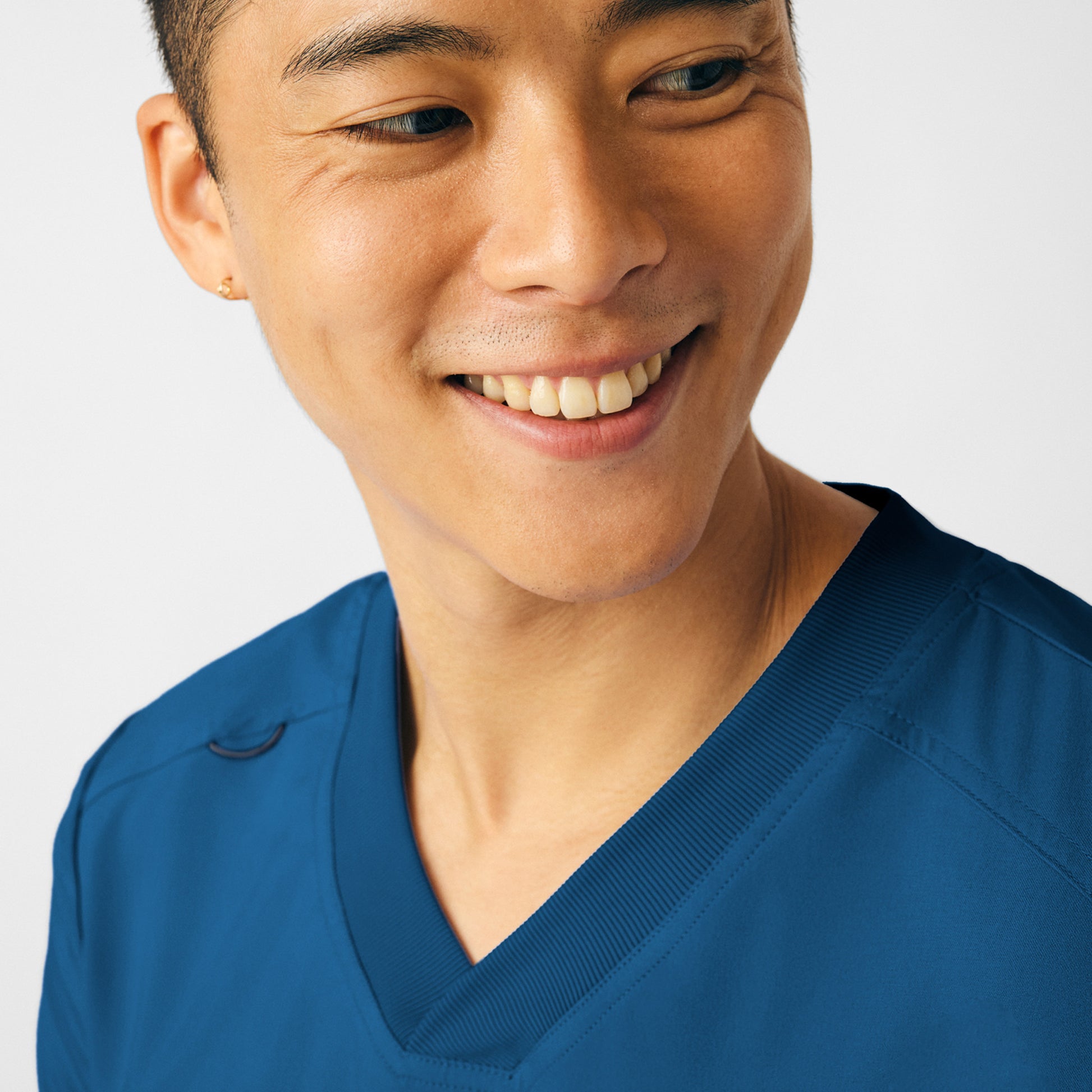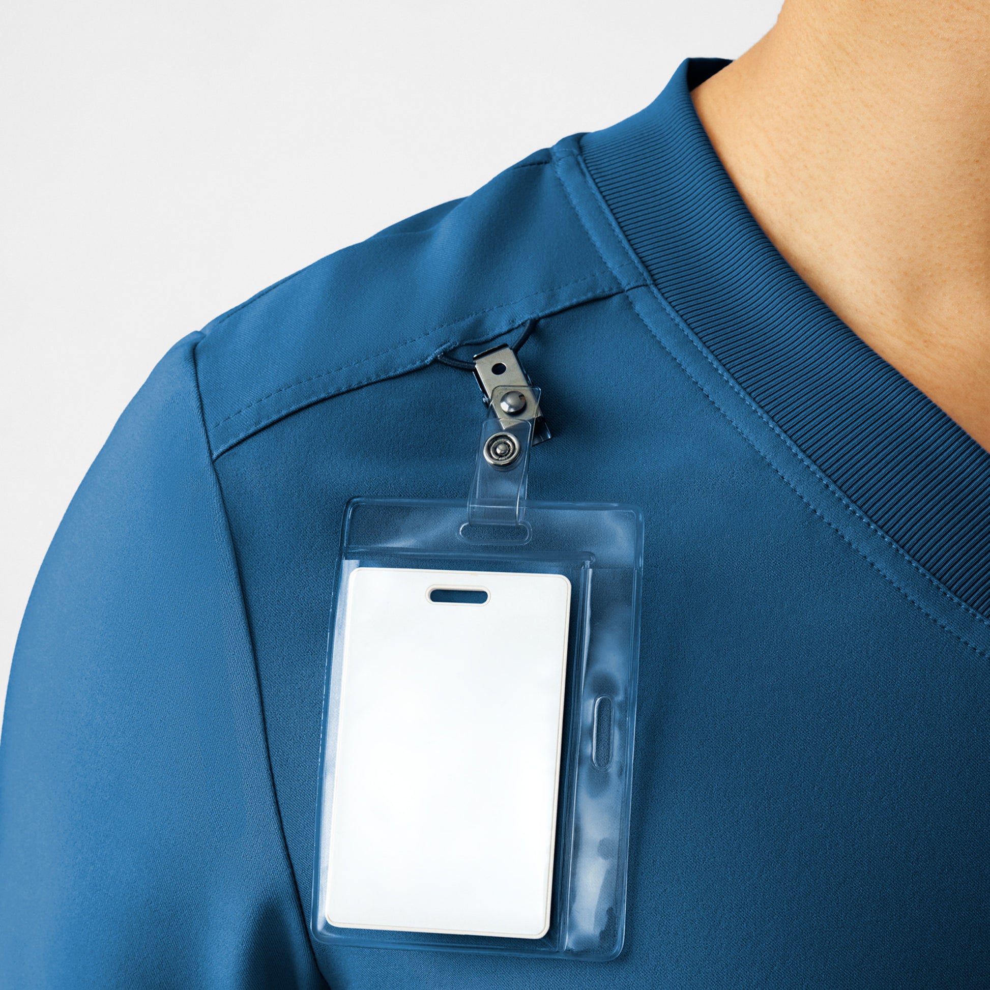 This Men's Fit, V-neck top has great features like a rib knit neckband and rib knit side panels that will give you a comfortable and sleek fit. With 1 zipper pocket to keep personal items secured, 1 separate patch chest pocket to store additional items and a ID badge loop.