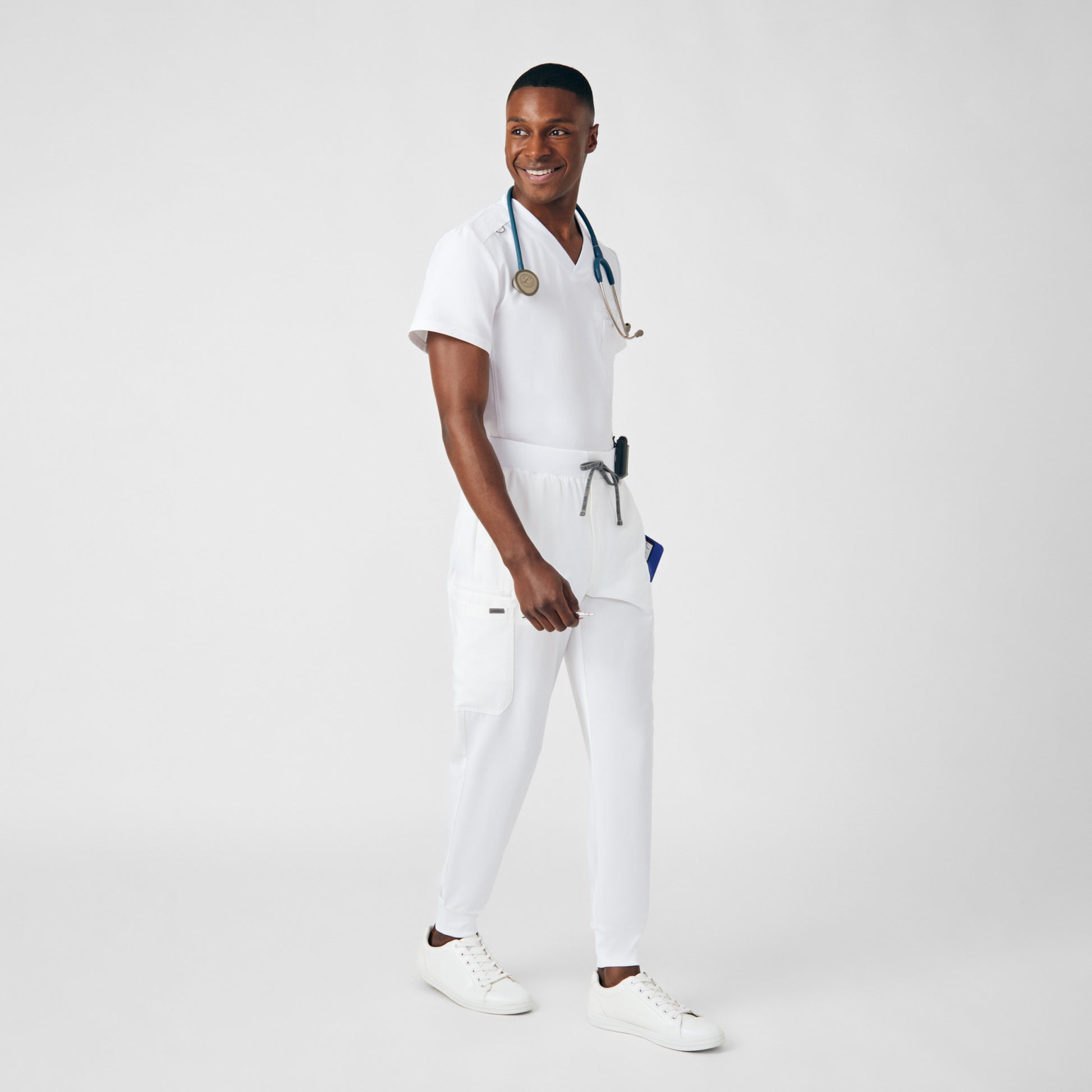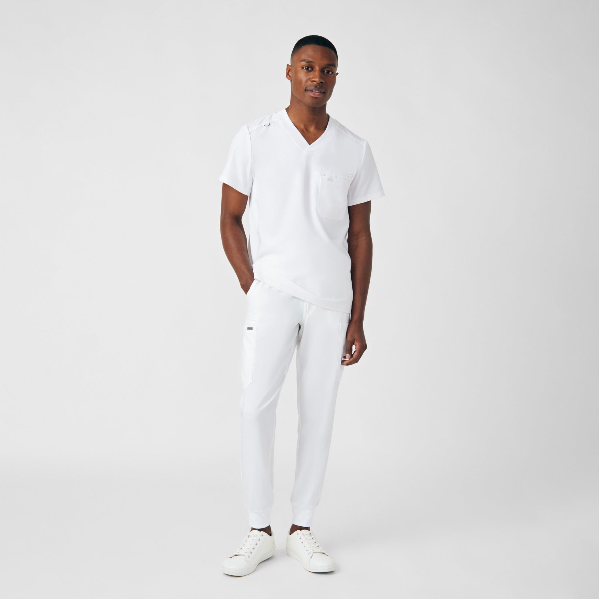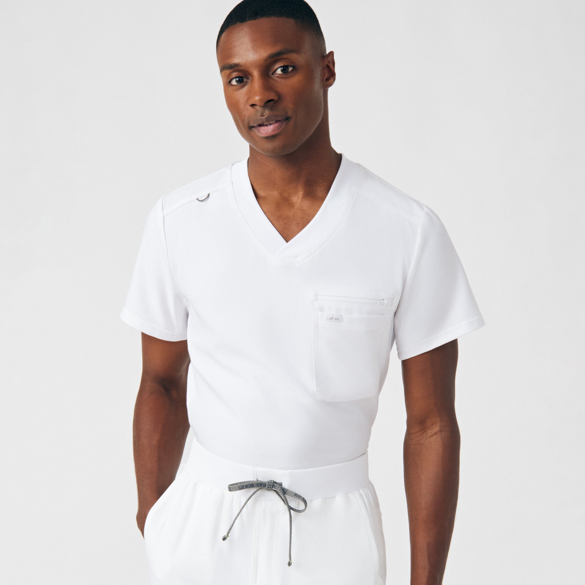 This Men's Fit, V-neck top has great features like a rib knit neckband and rib knit side panels that will give you a comfortable and sleek fit. With 1 zipper pocket to keep personal items secured, 1 separate patch chest pocket to store additional items and a ID badge loop.
