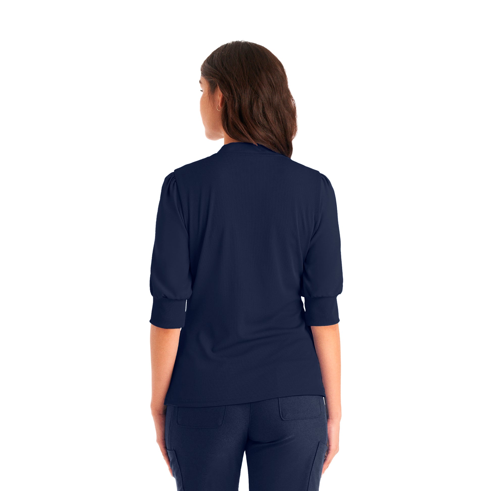 Mix media Contemporary Fit top with puff sleeves that are finished with rib knit cuffs for stretch and mobility. A rib knit body provides next level comfort as you move throughout your day. Features a faux button placket, side vents, 1 chest pocket, and 2 side welt pockets to hold any additional items you may need.