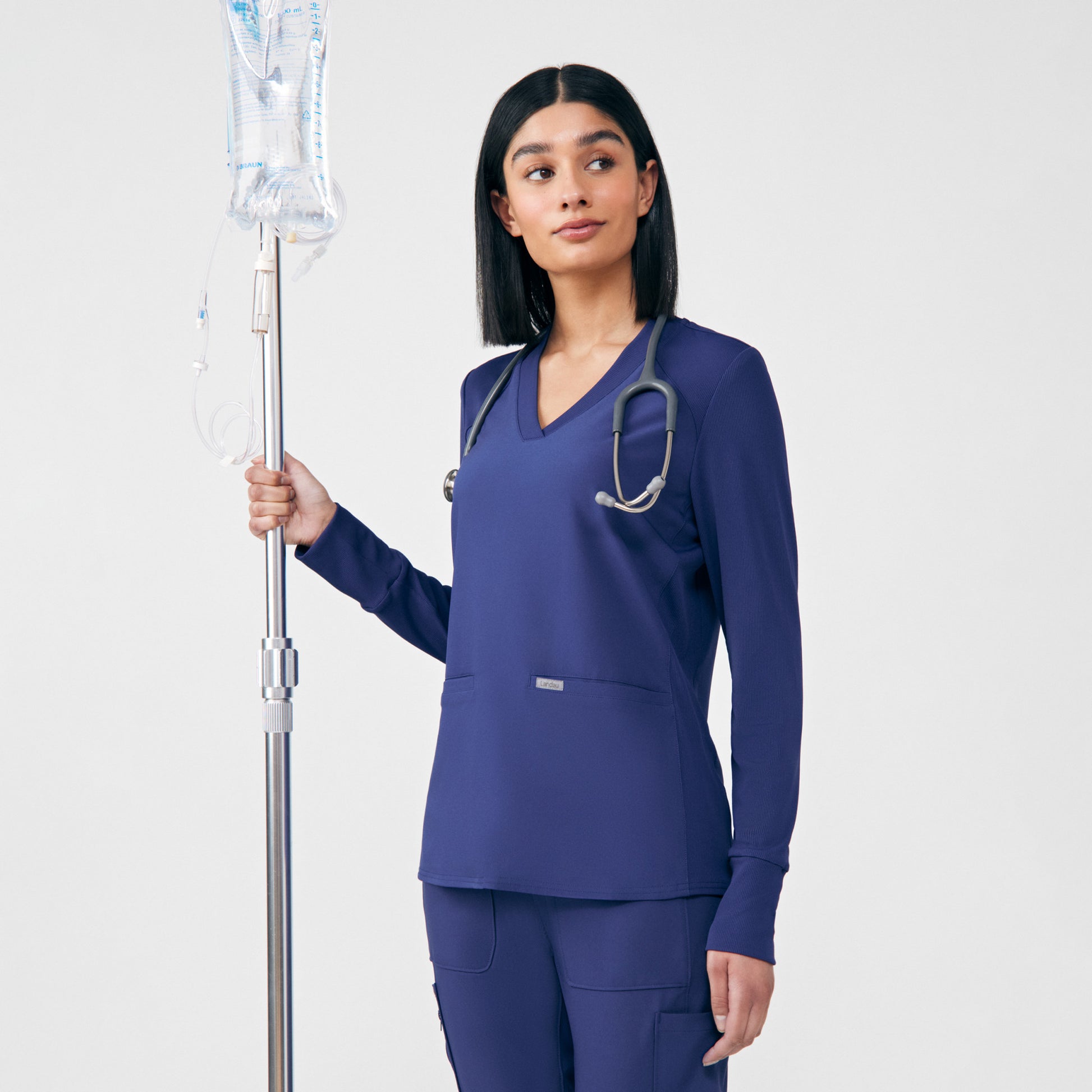 Perfect for layering or rocking solo, this versatile top has a sleek, athletic-inspired design that strikes the perfect balance between comfort and performance. The V-neckline and raglan sleeves offer a flattering, modern fit without sacrificing freedom of movement. Two front welt pockets provide convenient storage for your essentials, and the long sleeves with soft knit cuffs deliver a secure, comfortable fit.