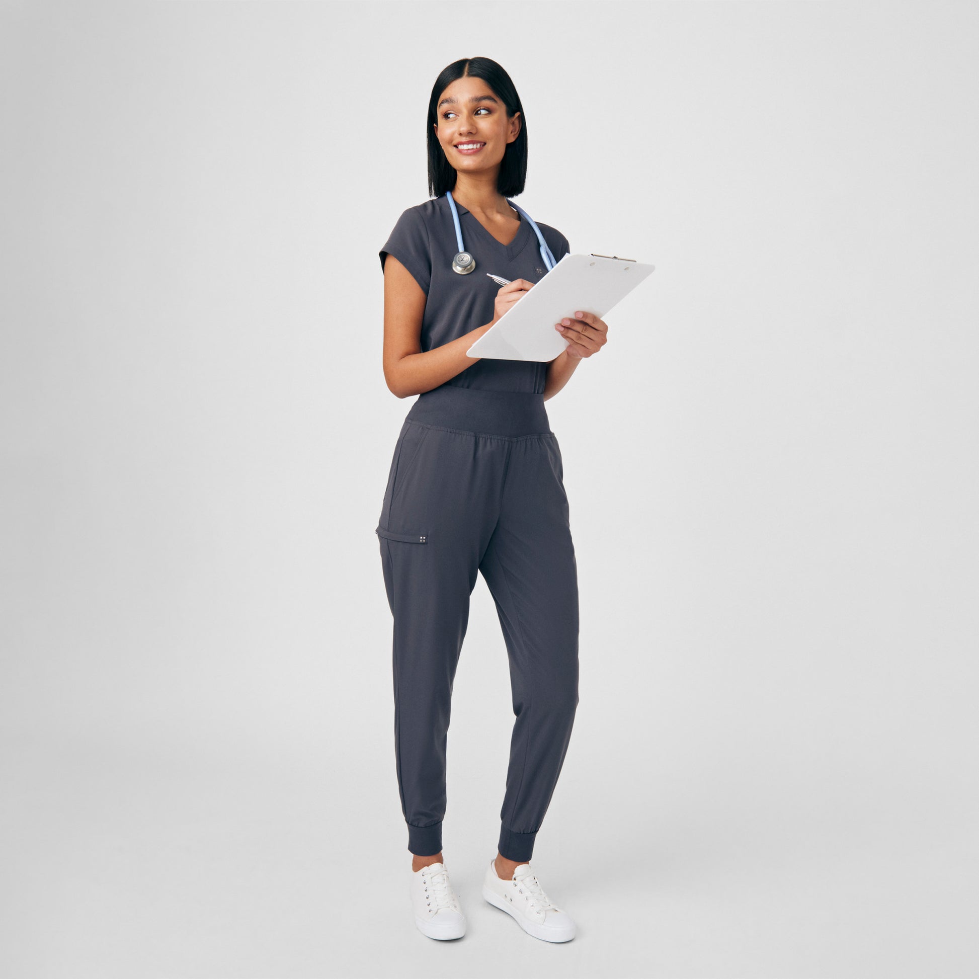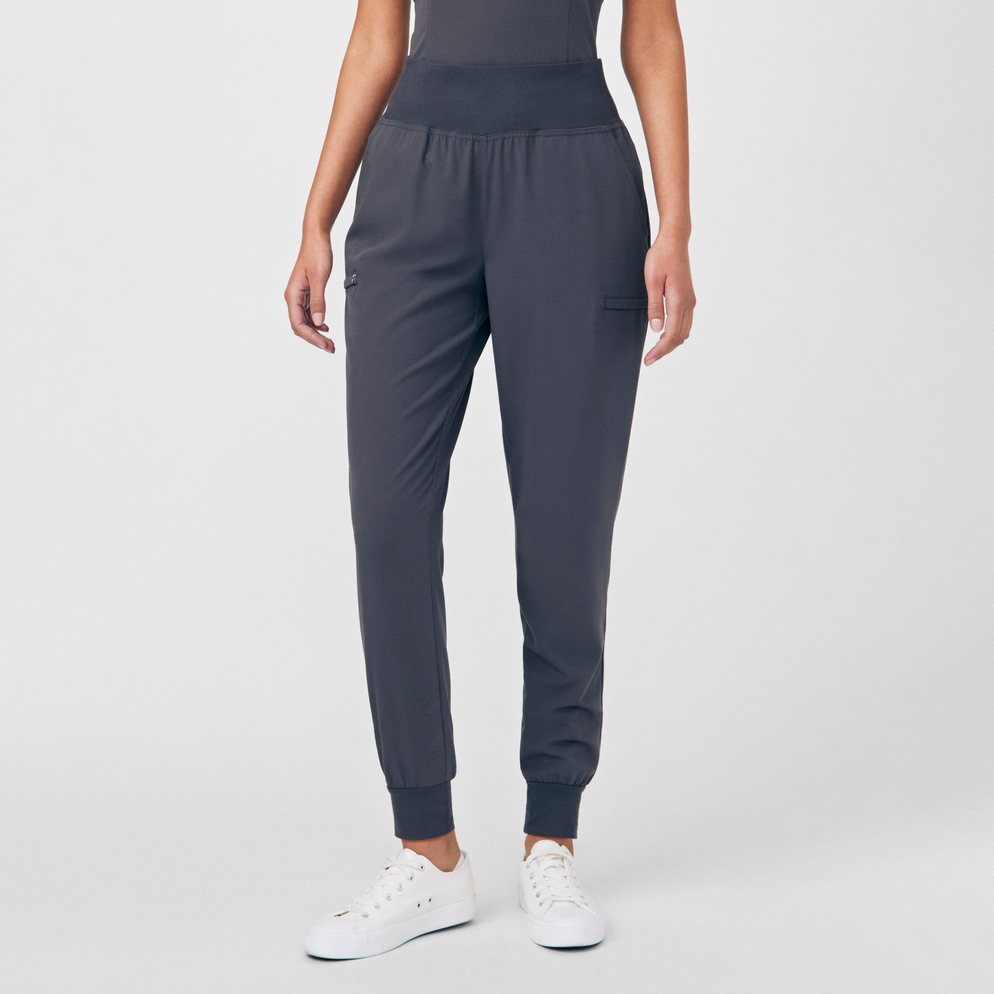 Modern Fit, High-Rise jogger with 6 pockets; 2 front pockets, 2 zipper cargo pockets and 2 back pockets. A cozy knit waistband for comfort and drawstring for adjustability. Knit cuffs complete the easy jogger silhouette.