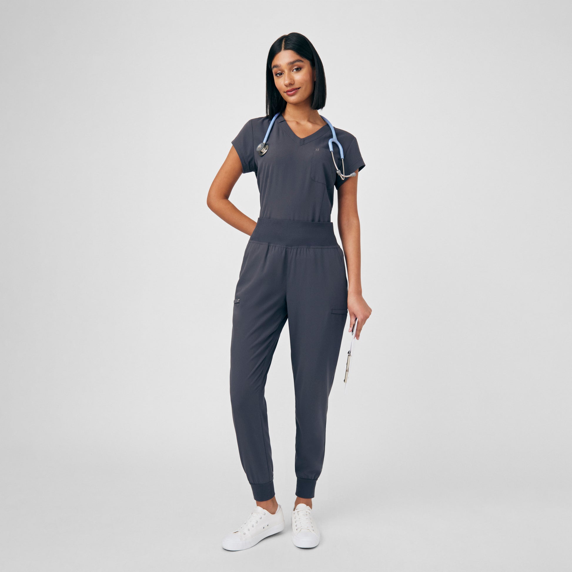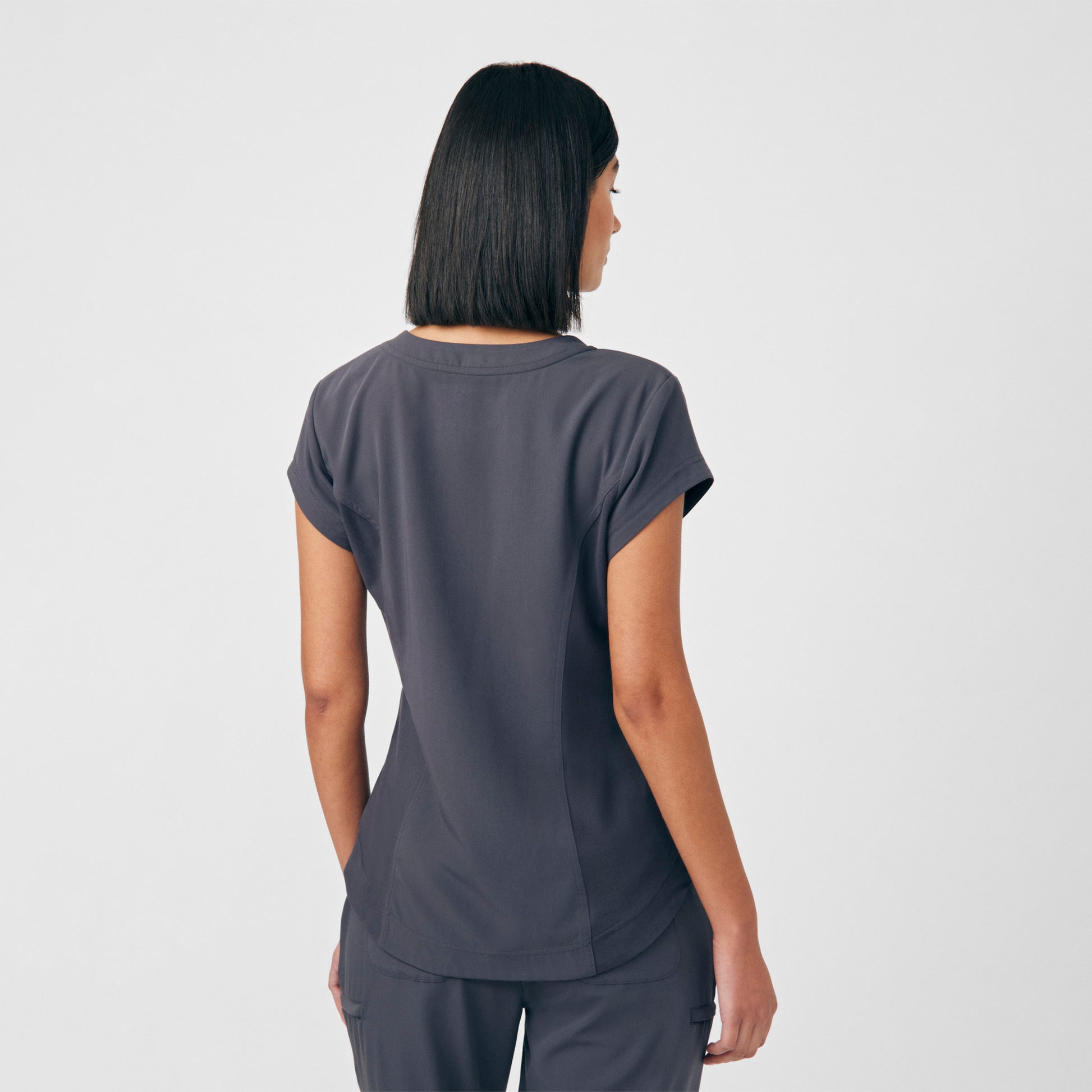 This Modern Fit v-neck top offers a tailored fit with front princess darts and back princess seams. Features a single chest pocket and shirttail hem for an easy tuck-in option. Cap sleeves and back side knit panels offer easy movement and added comfort.