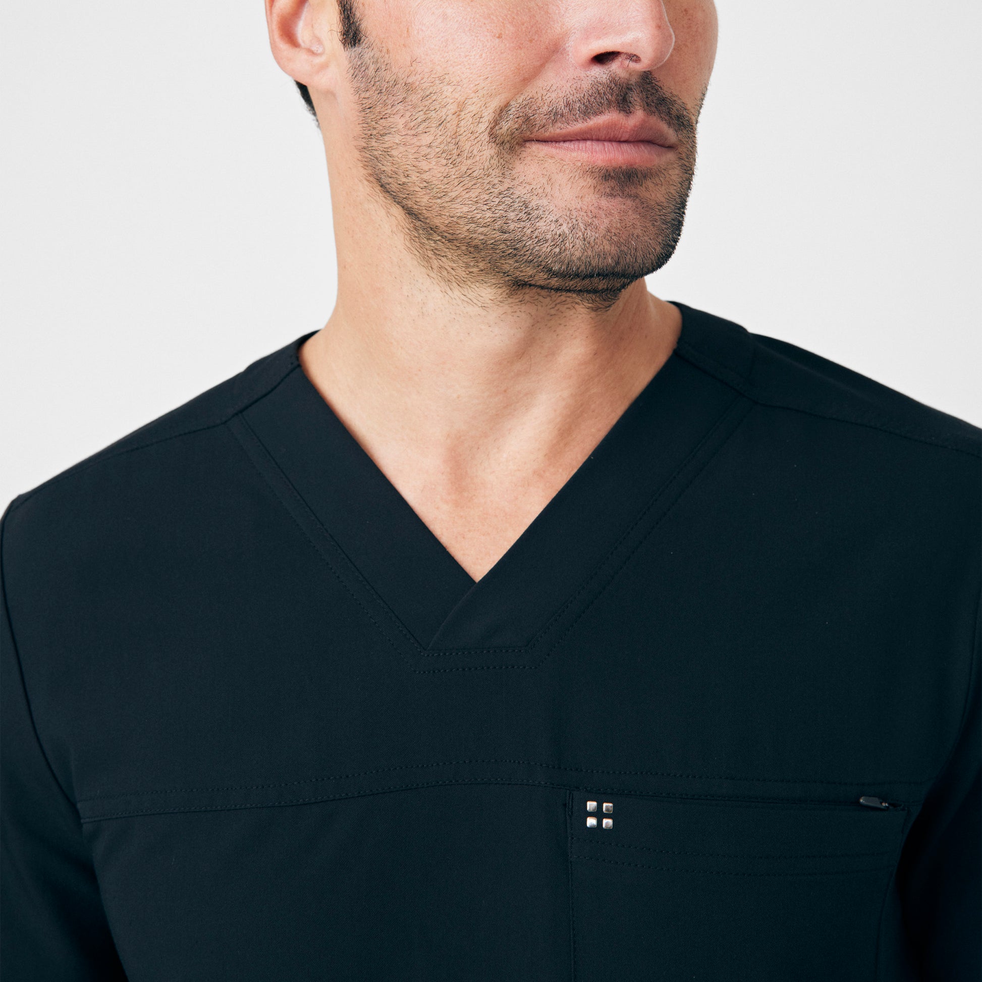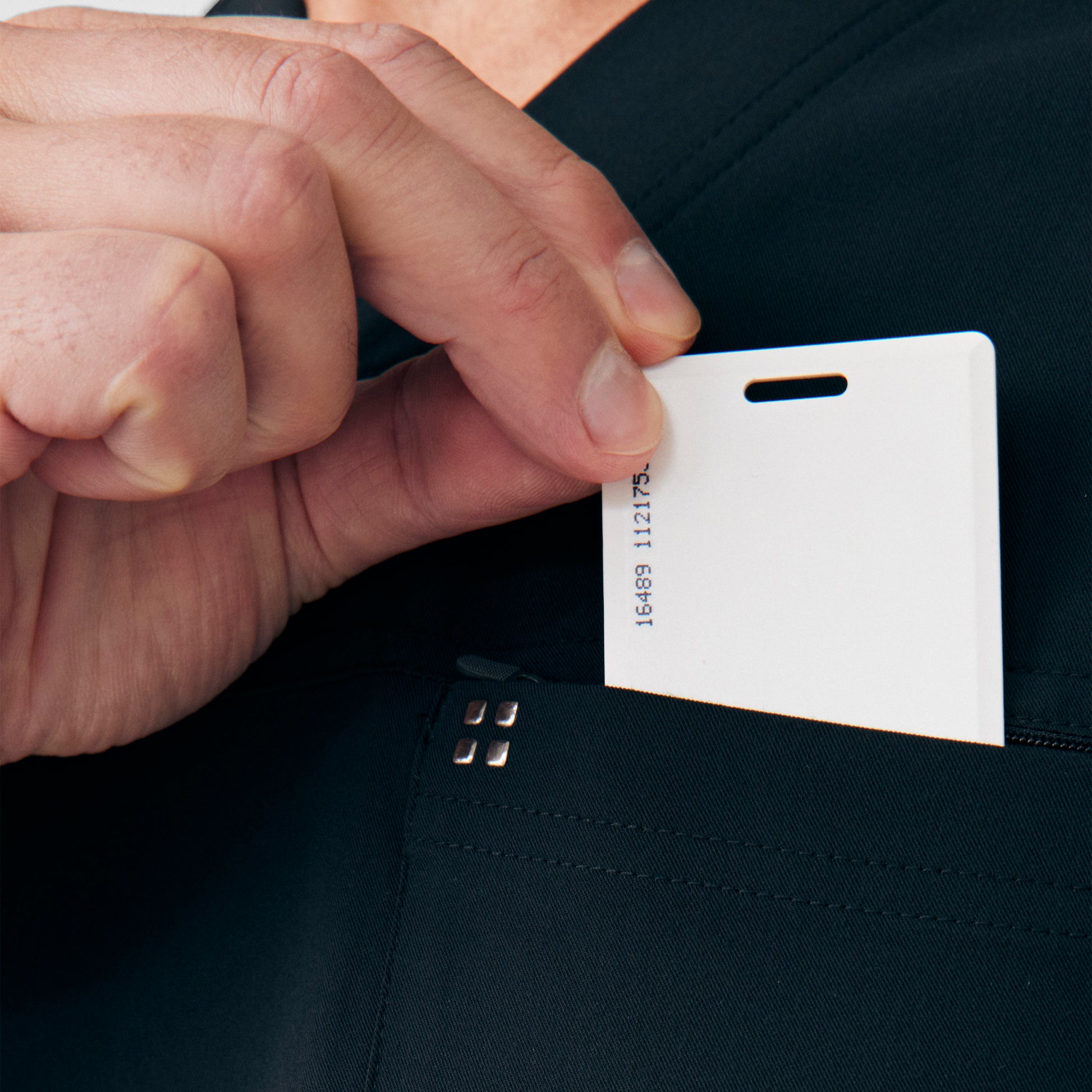 Modern Men's Fit V-Neck top has a double chest pocket, one with a zipper closure to keep your items readily available and secure. Wear this top tucked or untucked. Side hem slits for an easy fit and extra mobility.